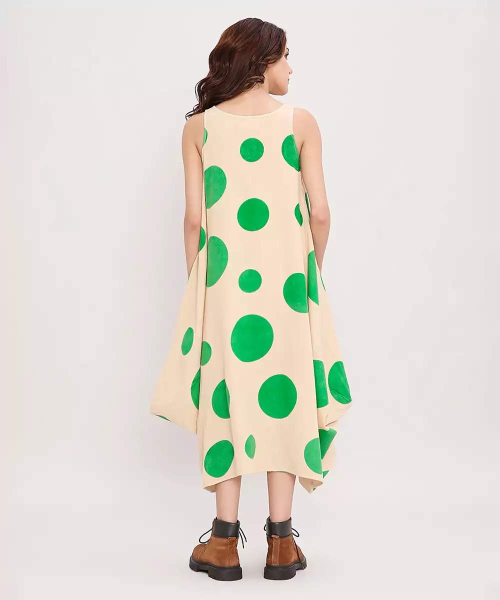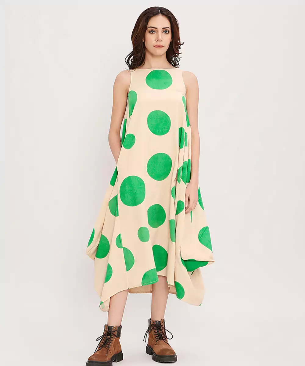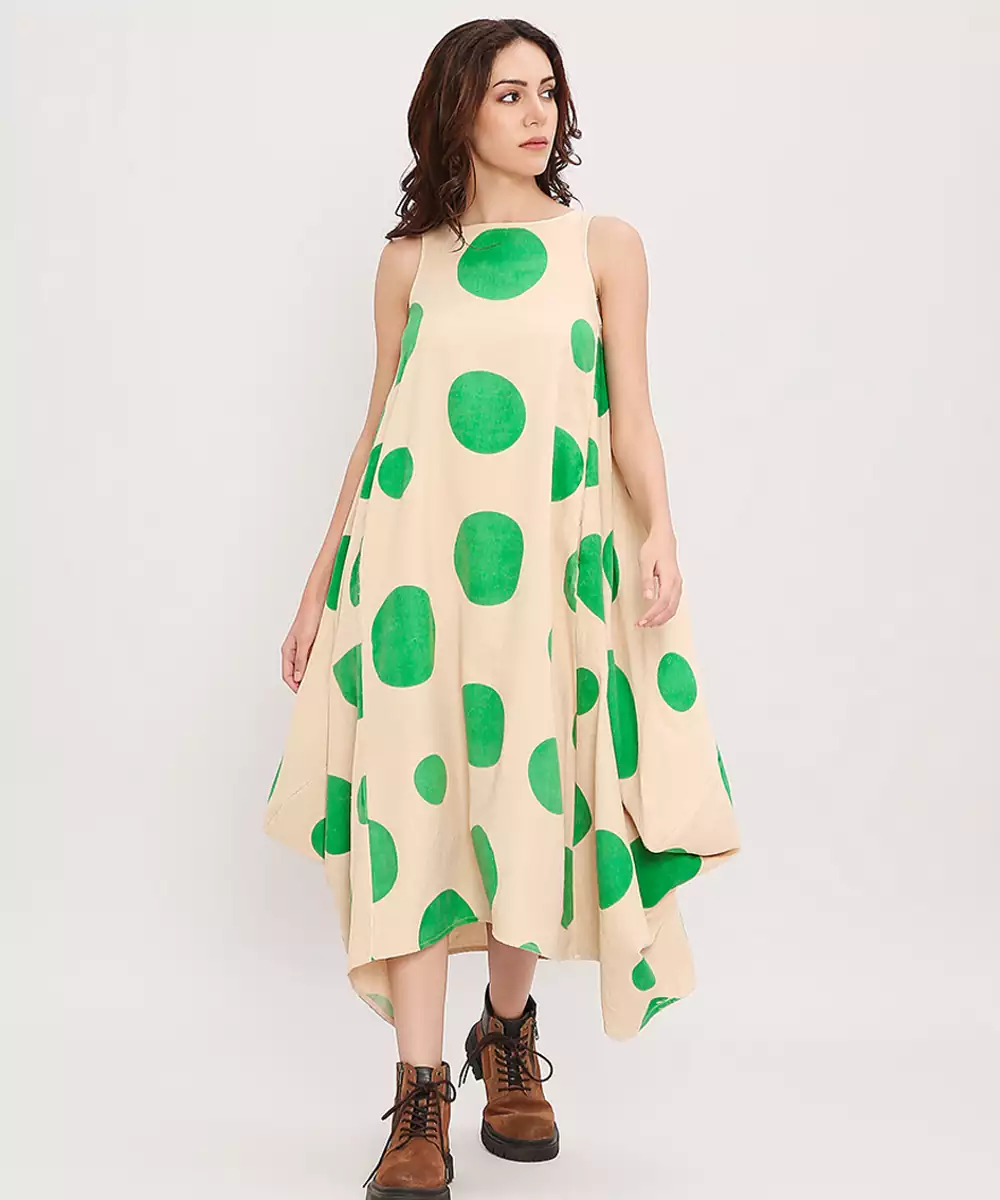 This Green Printed Cotton Polka Dress Brings Together Vibrant Charm And Everyday Comfort. Crafted From Soft, Breathable Cotton, It Features Lively Prints That Add A Cheerful Touch. Its Easy, Flattering Silhouette Makes It Perfect For Casual Outings, Daytime Events, Or Relaxed Gatherings, Offering Effortless Style With A Fresh, Graceful Appeal.