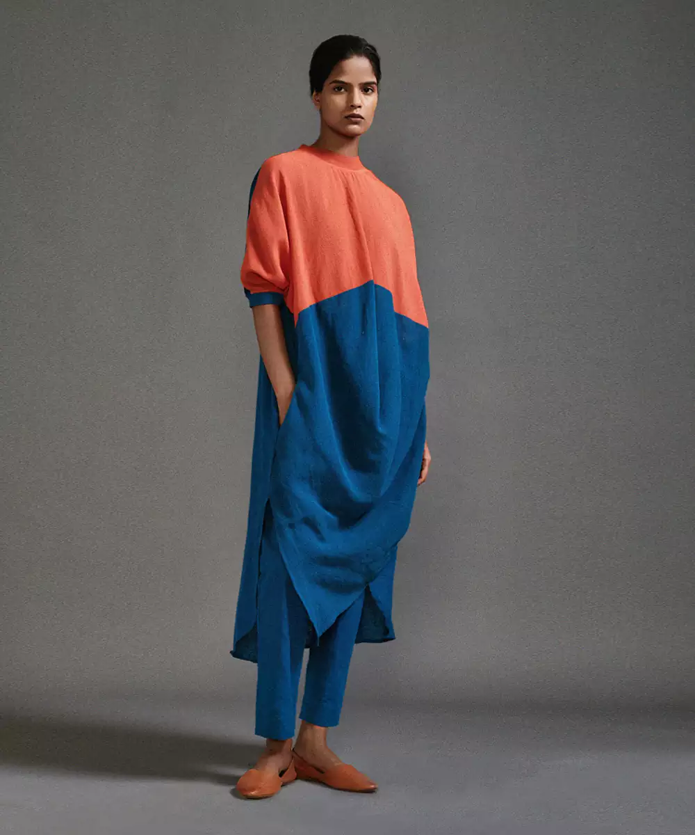 A Colour Block Draped Tunic With Ribbed Collar And Cuffs. Side Pockets And Back Button Opening For Ease. Paired With Pants.