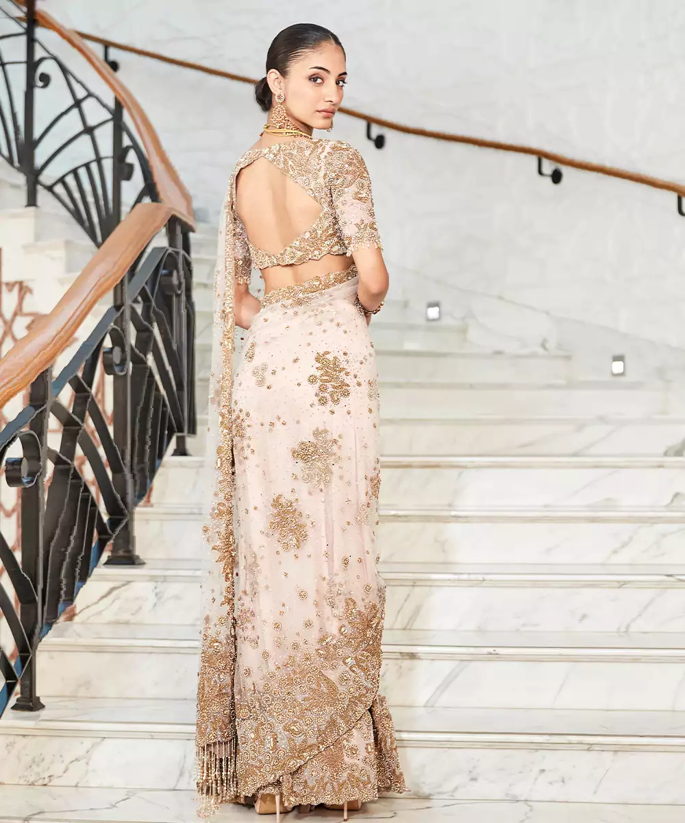 This Ivory Embroidered Tulle Saree Set Showcases A Soft, Sheer Texture With Intricate Craftsmanship. The Elegant Design Enhances Its Graceful Appeal, Making It Ideal For Festive And Special Occasions. A Timeless Outfit That Blends Subtle Charm With Refined Sophistication.