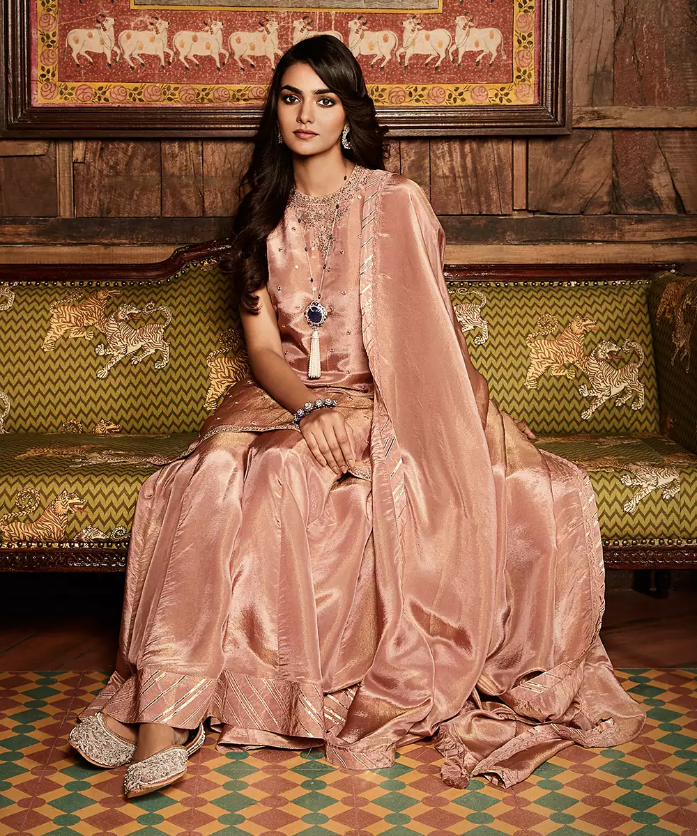 The Rose Tissue Paaro Sharara Set Features Embroidery With Mirrors And Antique Beaded Zardozi On Kurta Paired With A Flowy Sharara And Dupatta .