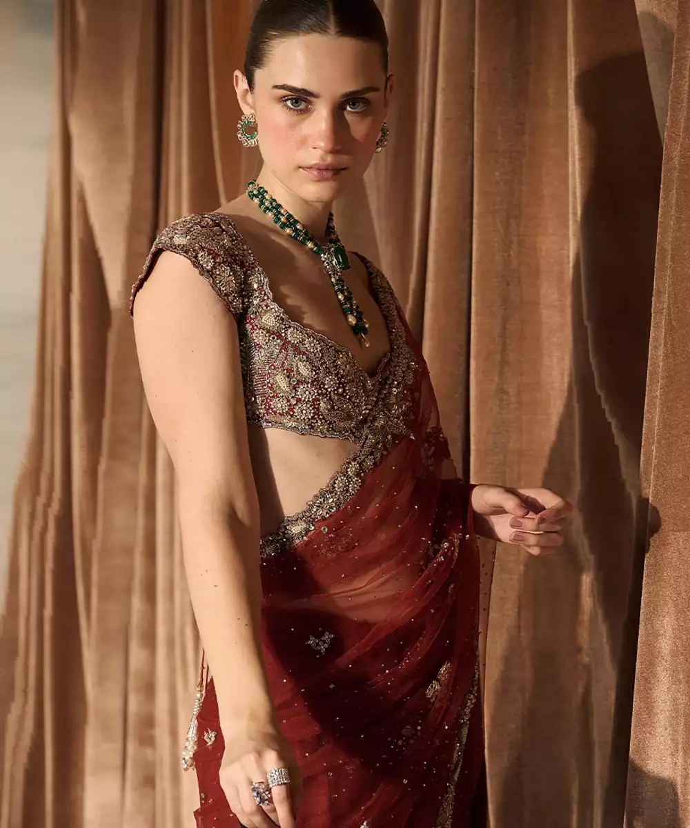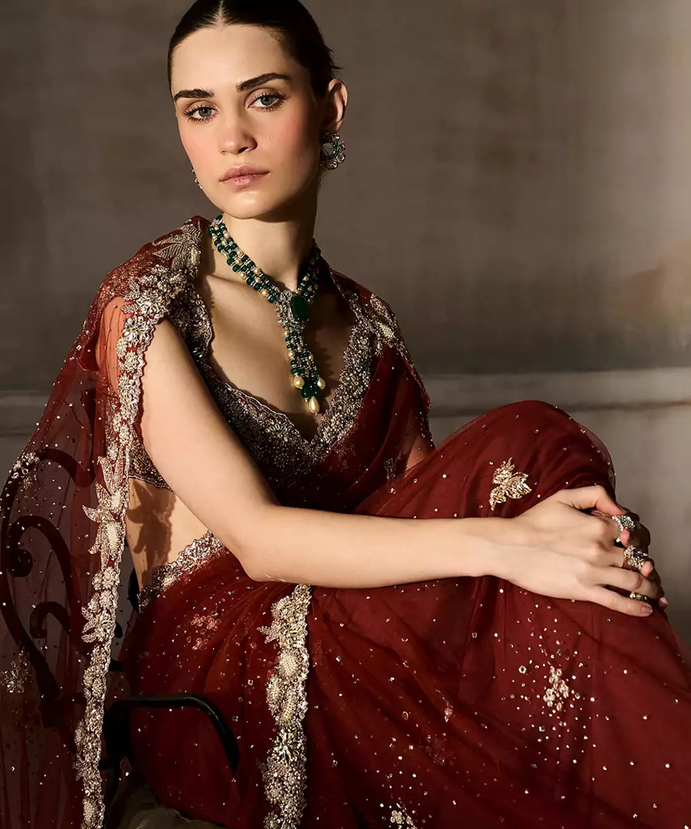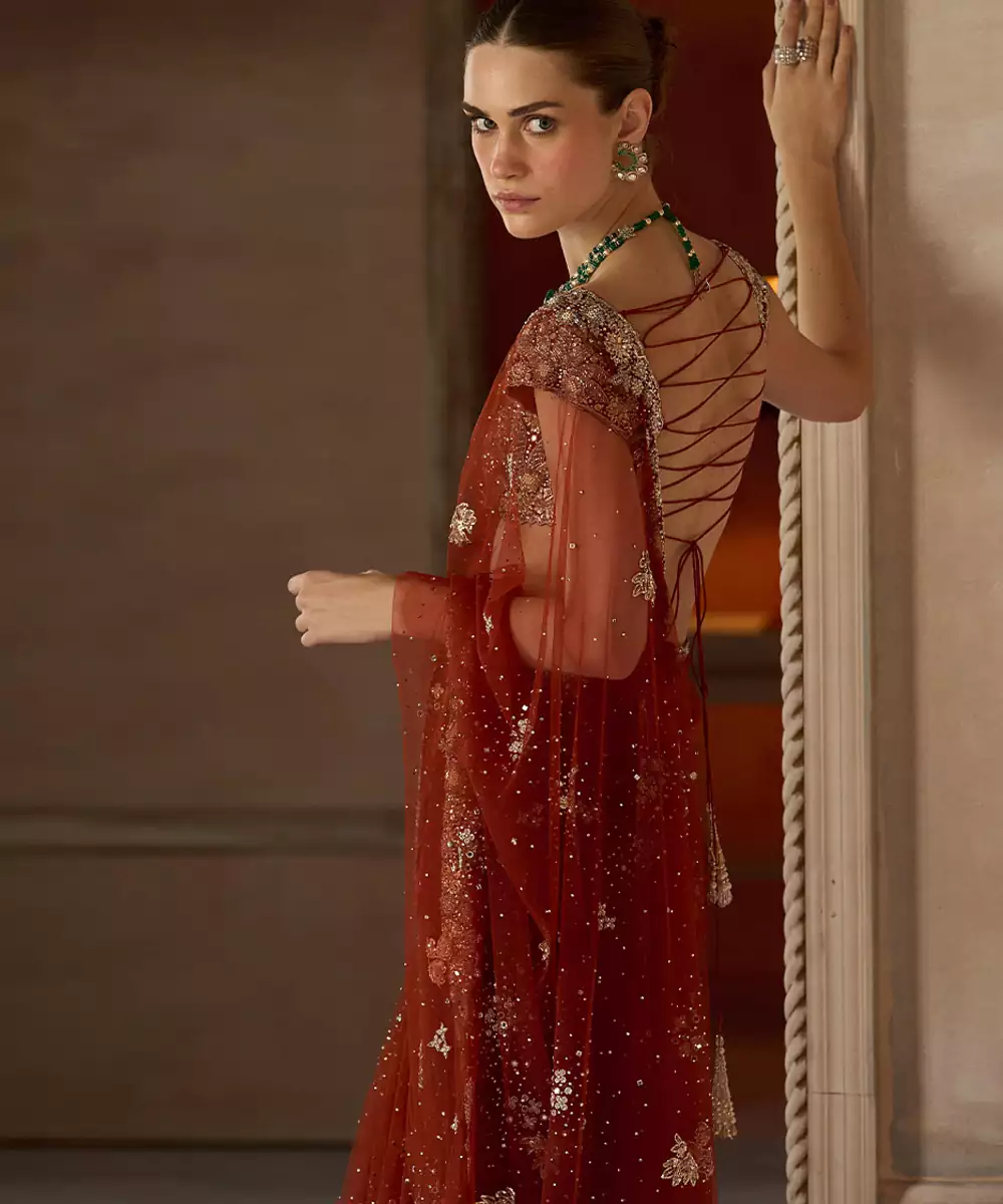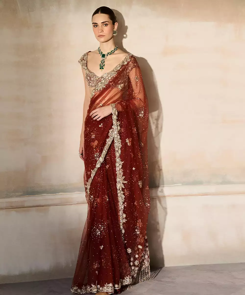Rust Red Embroidered Tulle Saree With Veil