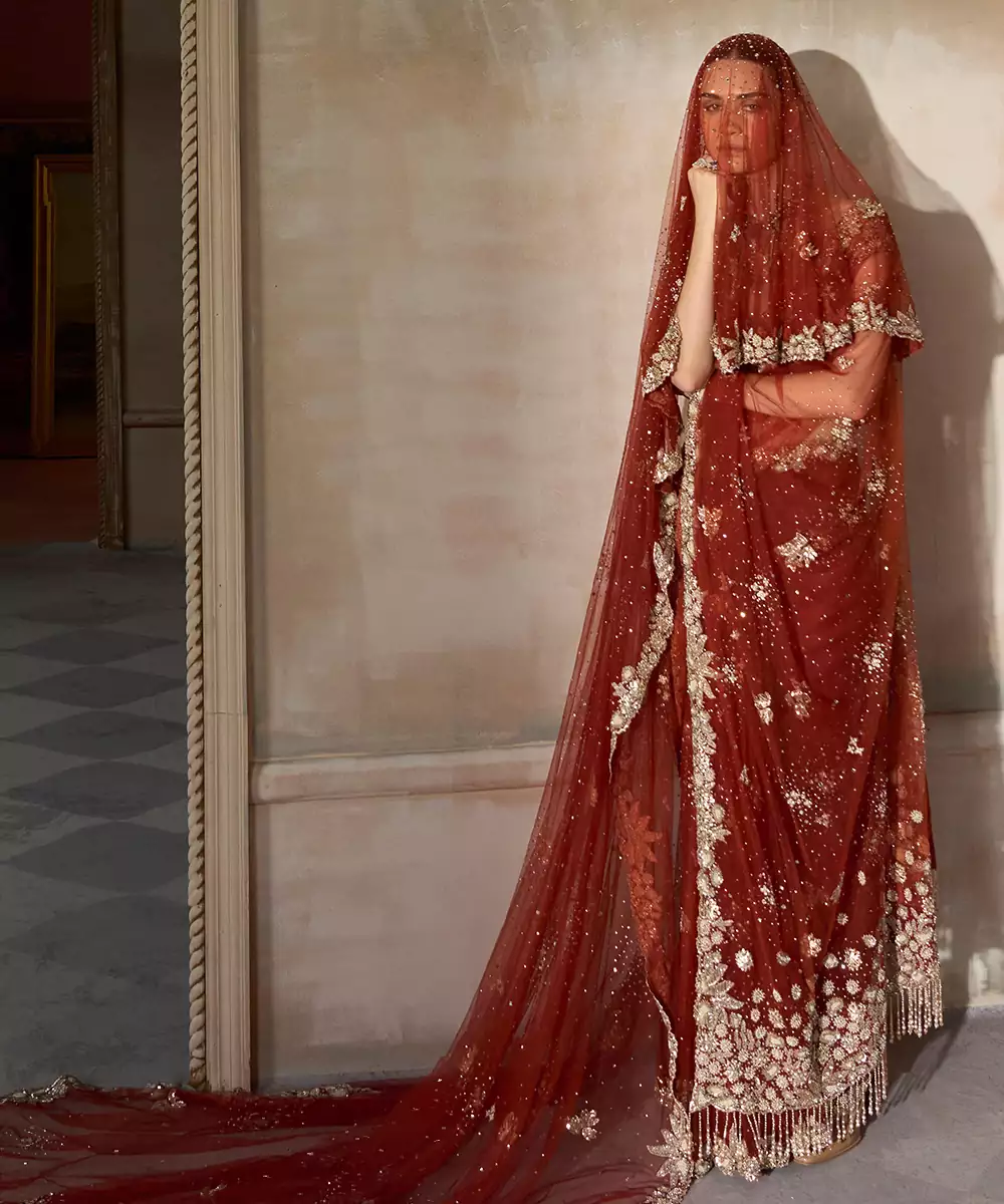 This Rust Red Embroidered Tulle Saree With Veil Showcases Soft, Layered Texture With Intricate Embroidery. The Elegant Drape And Matching Veil Enhance Its Bridal Appeal, Making It Ideal For Special Occasions. A Graceful Outfit That Reflects Romantic Charm And Timeless Beauty.