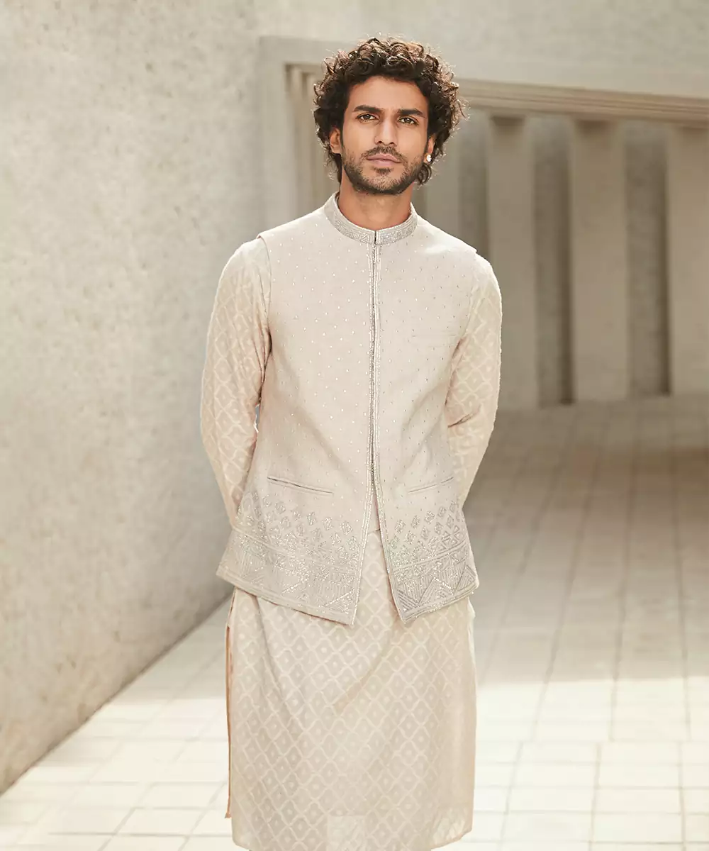 Crafted In Raw Silk, This Sleeveless Jacket Features Mardarin Collar, Delicate Texture And Zari Threadwork.