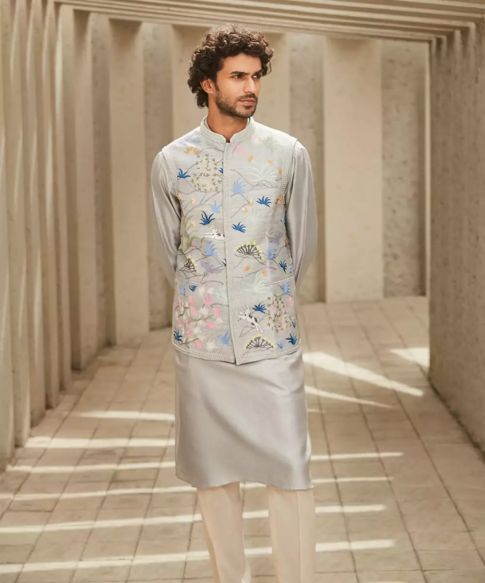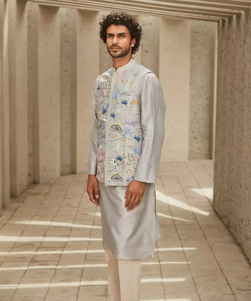 Crafted In Luxurious Chanderi, The Set Includes A Kurta Featuring Full Sleeves, Mandarin Neckline And Is Paired With A Pant.