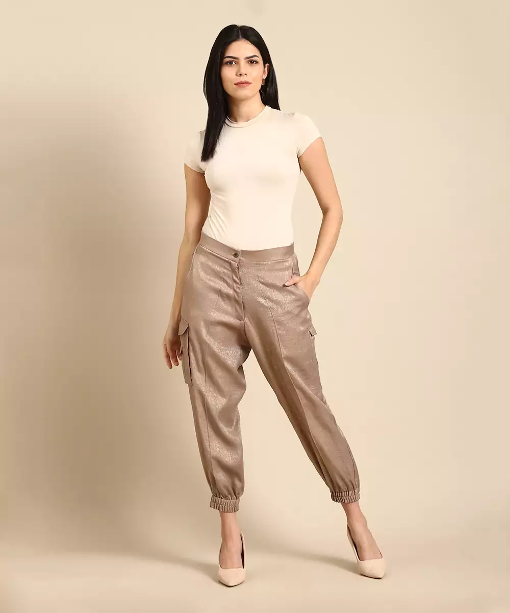 Beige Foil Pants With Comfort Acessable Pockets With Detailed Ankles.