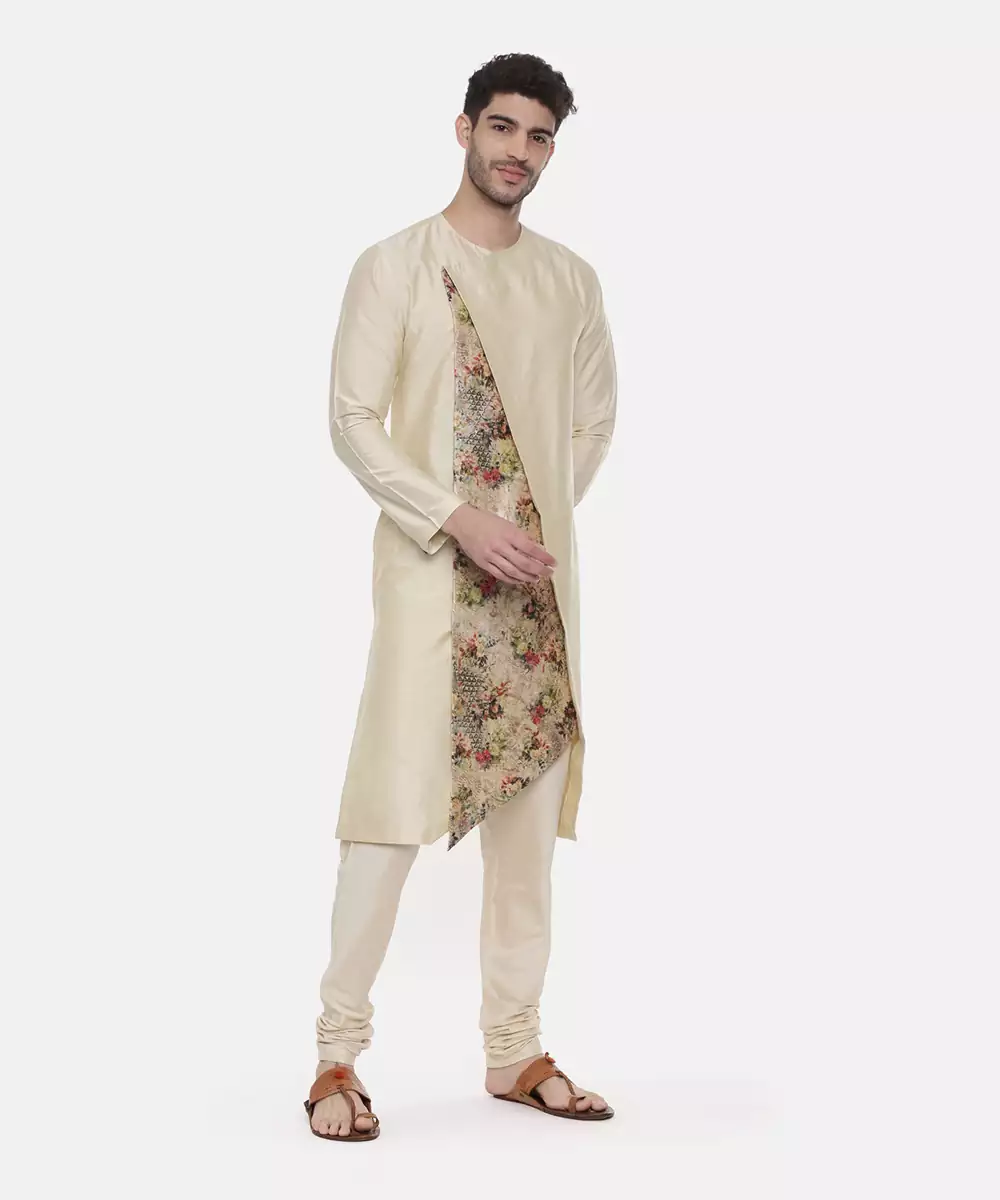 Stylishly Cut Away Kurta With Subtle Printed Detail On Silk Cotton Fabric And Chanderi. Perfect For A Mehendi Or Sangeeth Function.