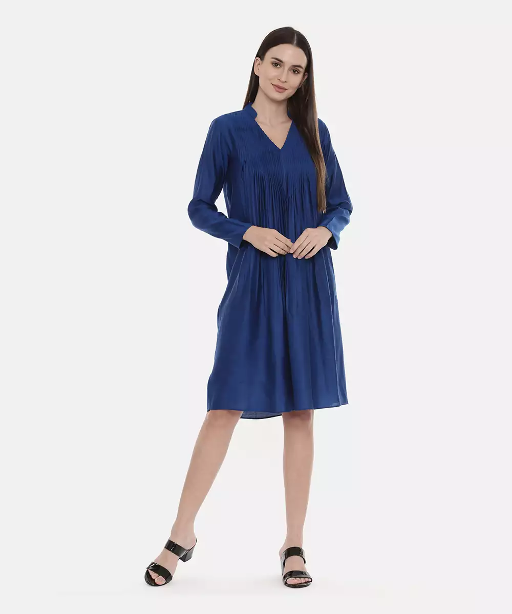 Royal Blue Pintuck Short Dress In Linen Satin. Pair With Long Earrings.