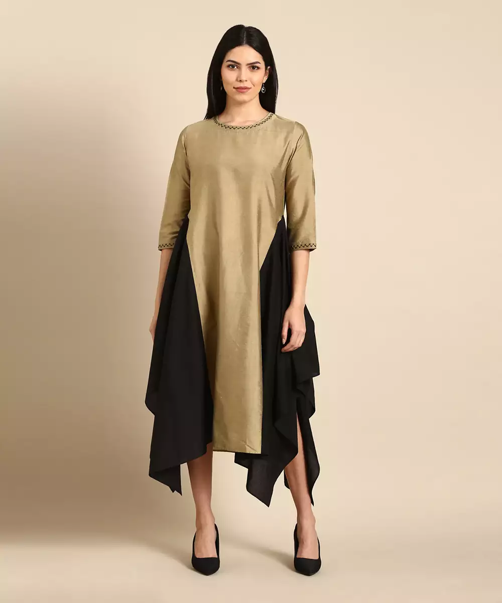 Subtle Embroidered Cotton Dress With Constrast Colour Panels. Perfect For Evening With Friends And Family.