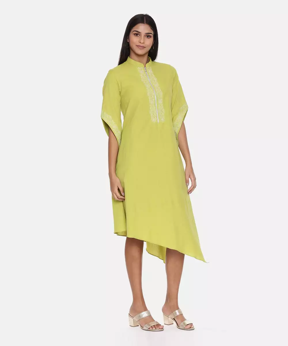 Green Main Cotton Asymmetric Embroidered Dress.