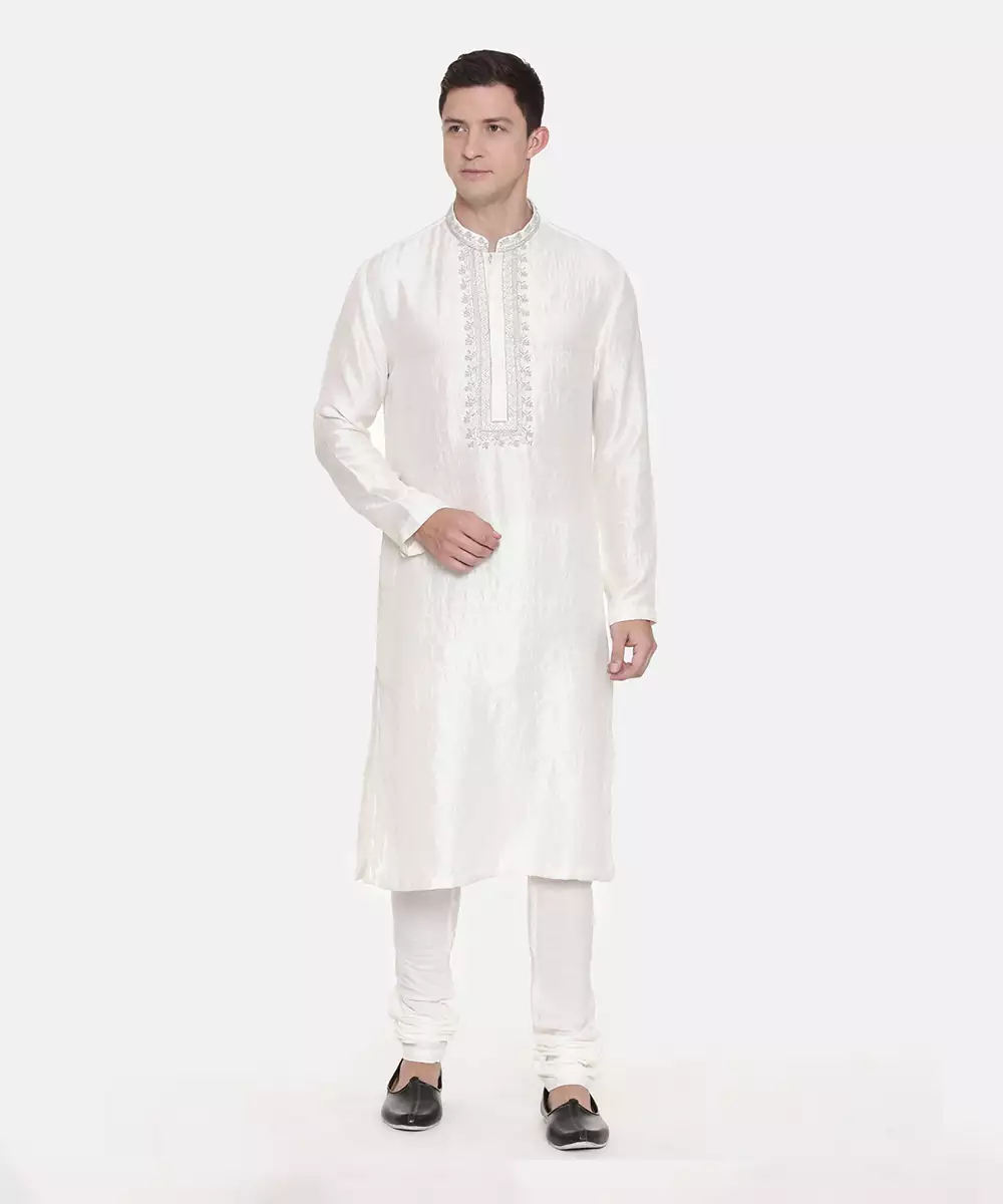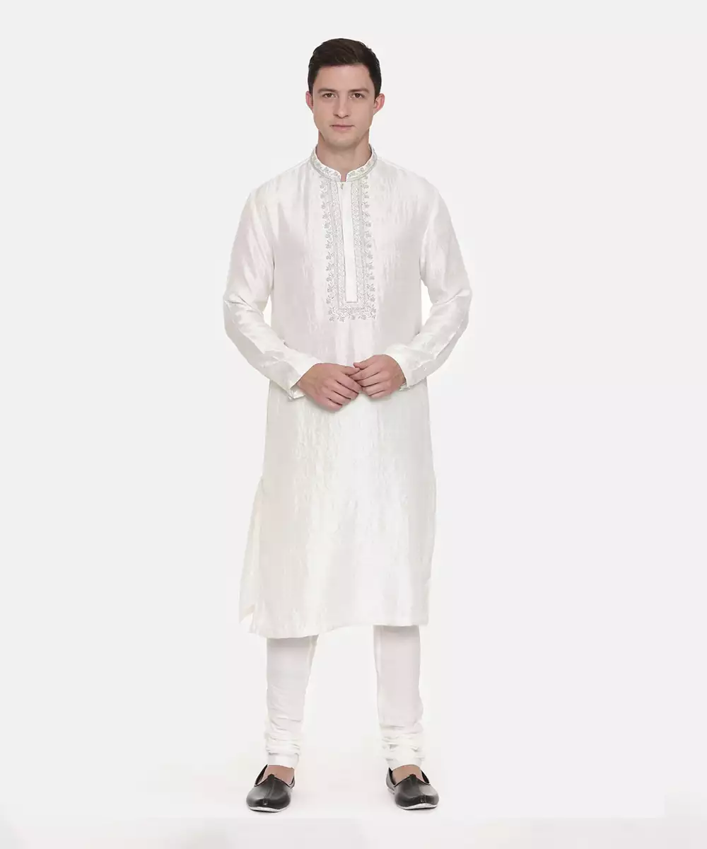 Silk Cotton Slub Fabric Kurta With Silver Gold Embroidery Detail.
