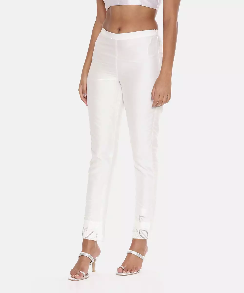 Ivory Silk Pants With Silver Embroidery Detail. Pair With Patching Top To Complete The Look.