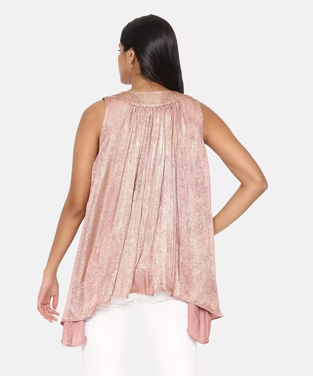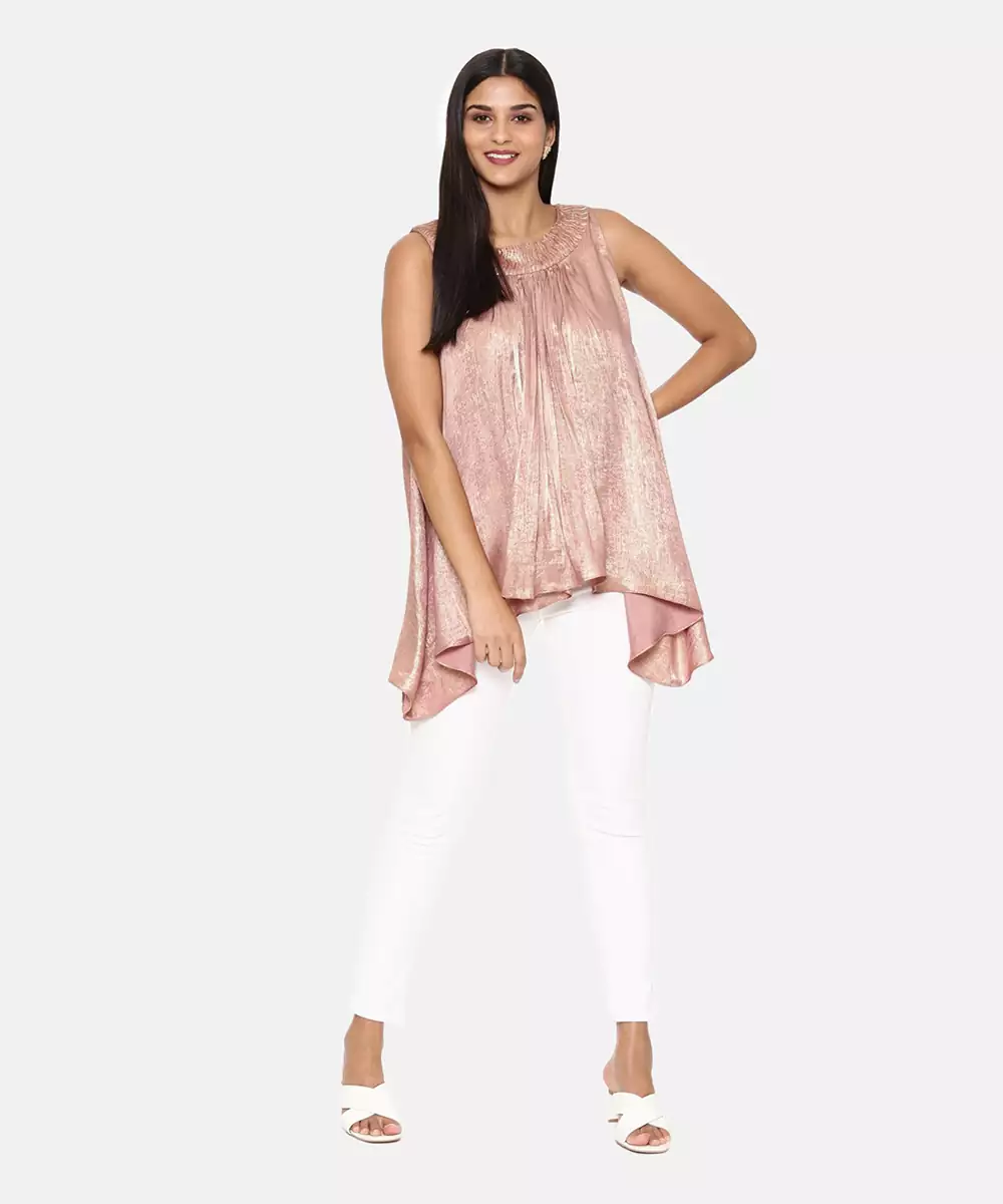 Shimmer Gold Pink Foil Print Top. Pair With White Tappered Pants To Complete The Look.