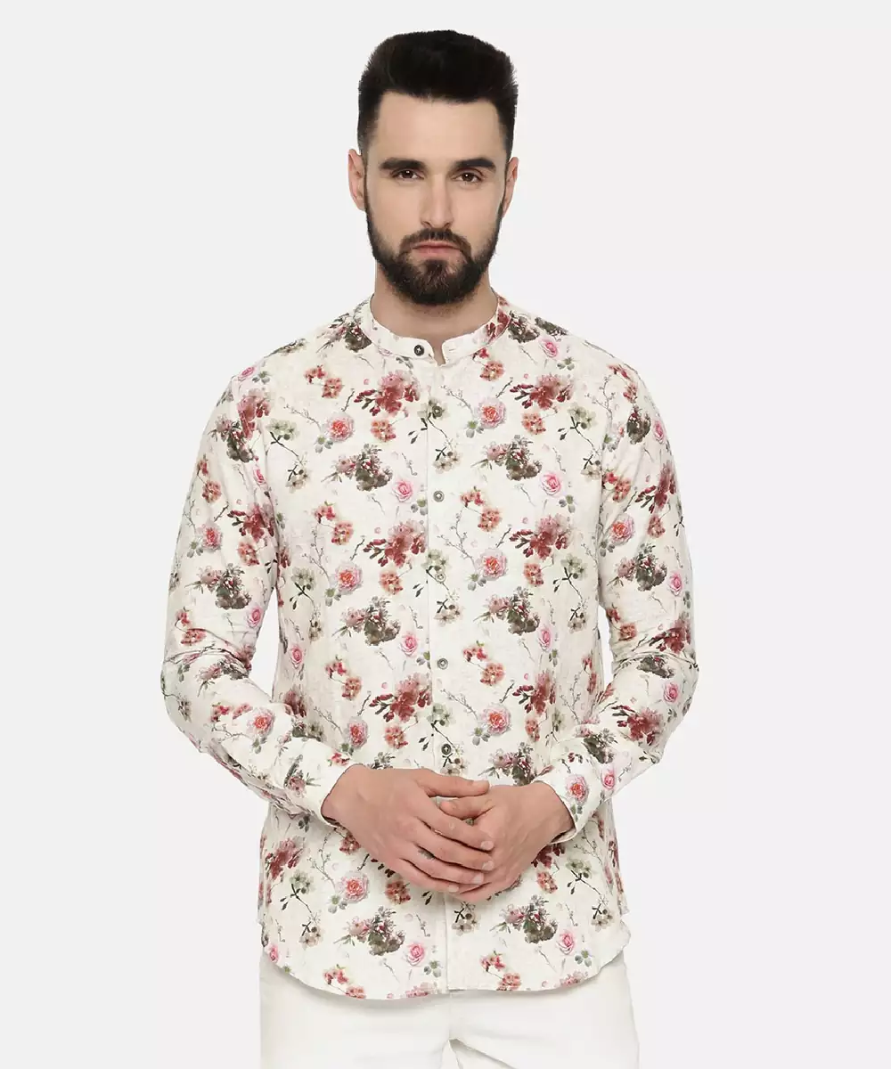 Printed Linen Shirt In Beige Red Floral Print. Pair With Denims Or Linen Pants