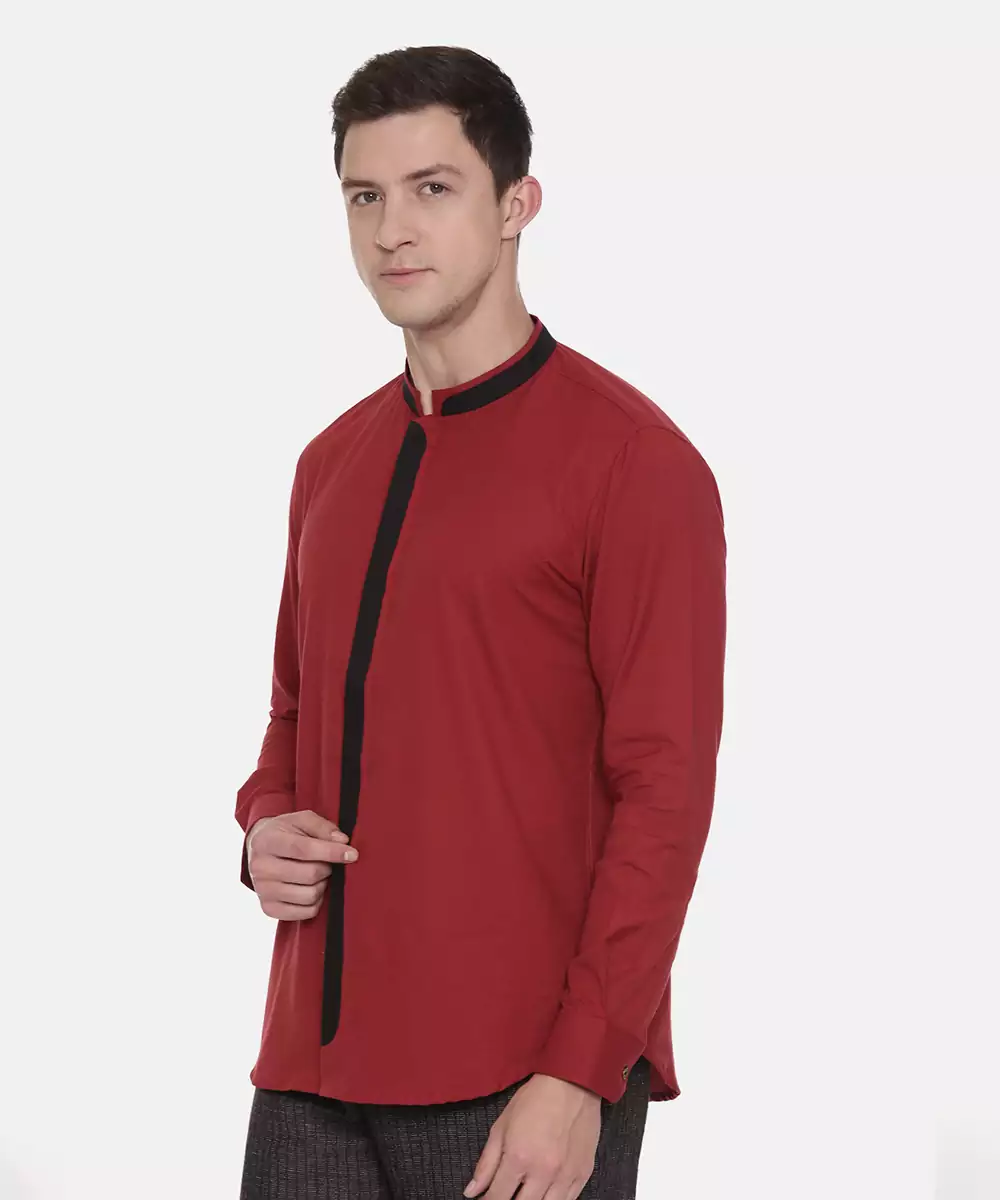 Red Cotton Shirt With Black Detail On Collar And Placket.