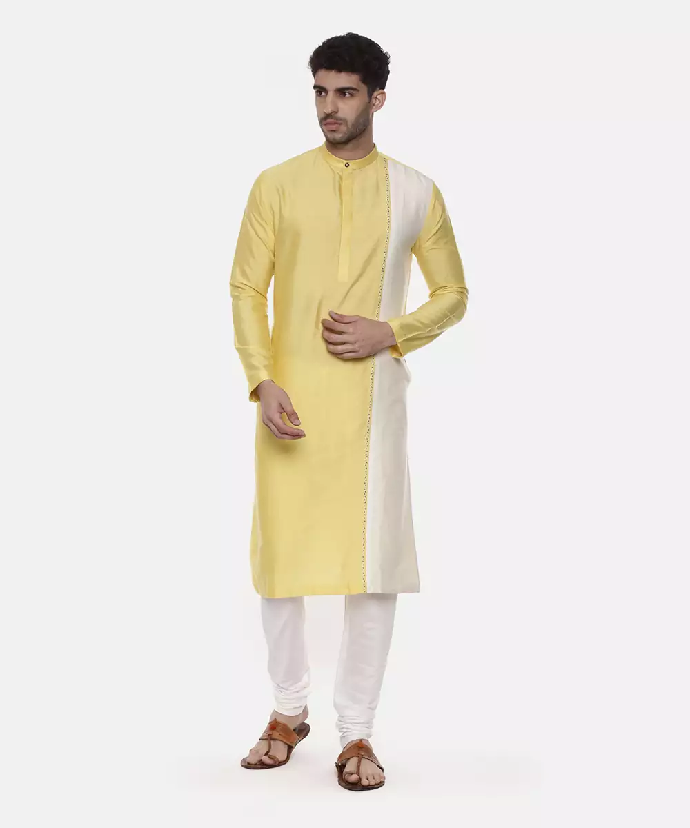 Classic Yellow Ivory Embroidered Silk Cotton Kurta With Chudidar. Perect For A Sangeeth Afternoon.