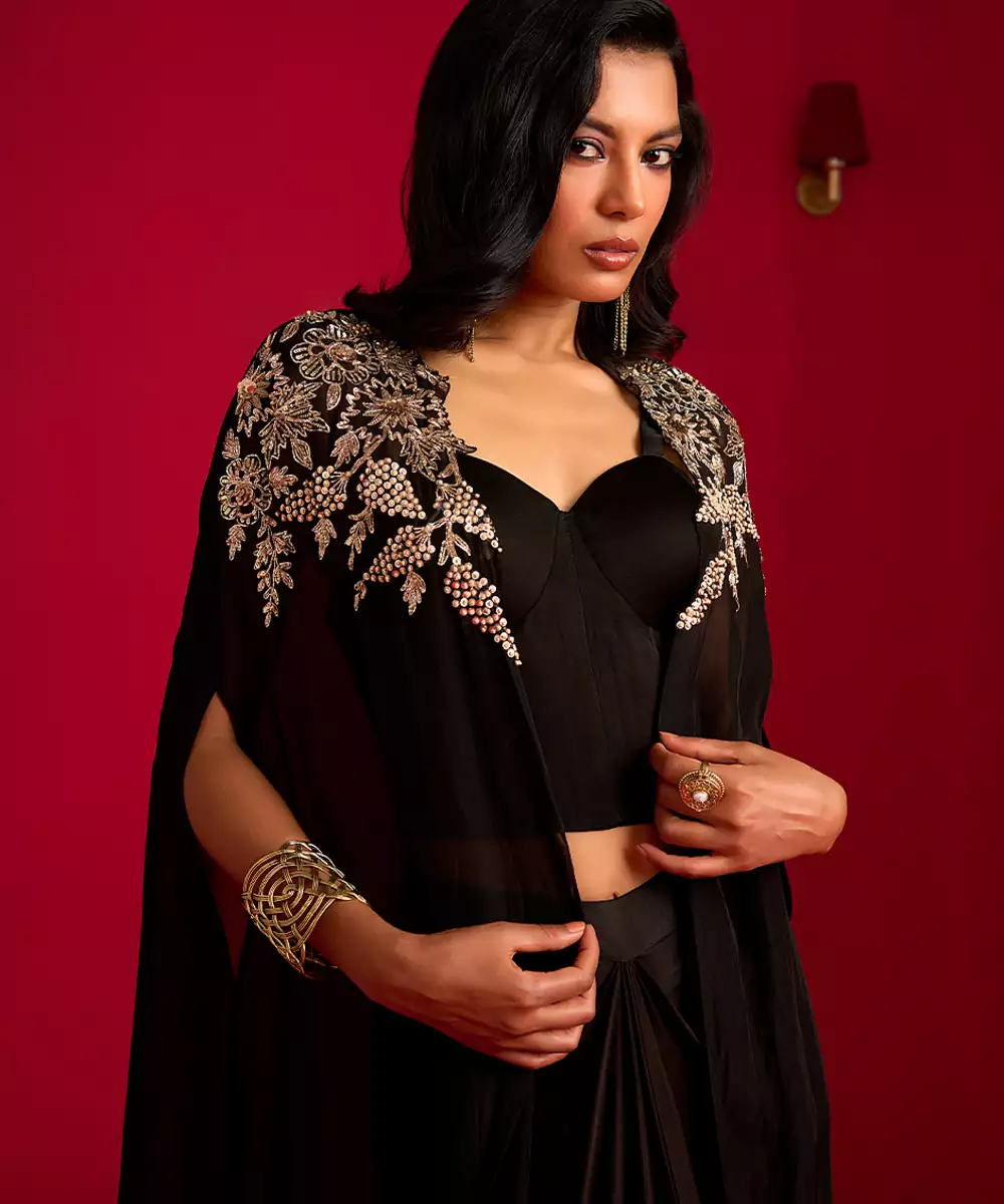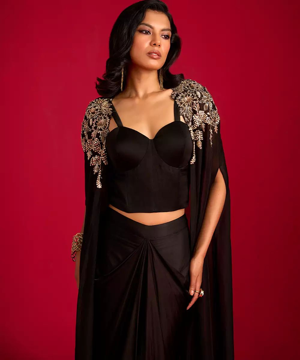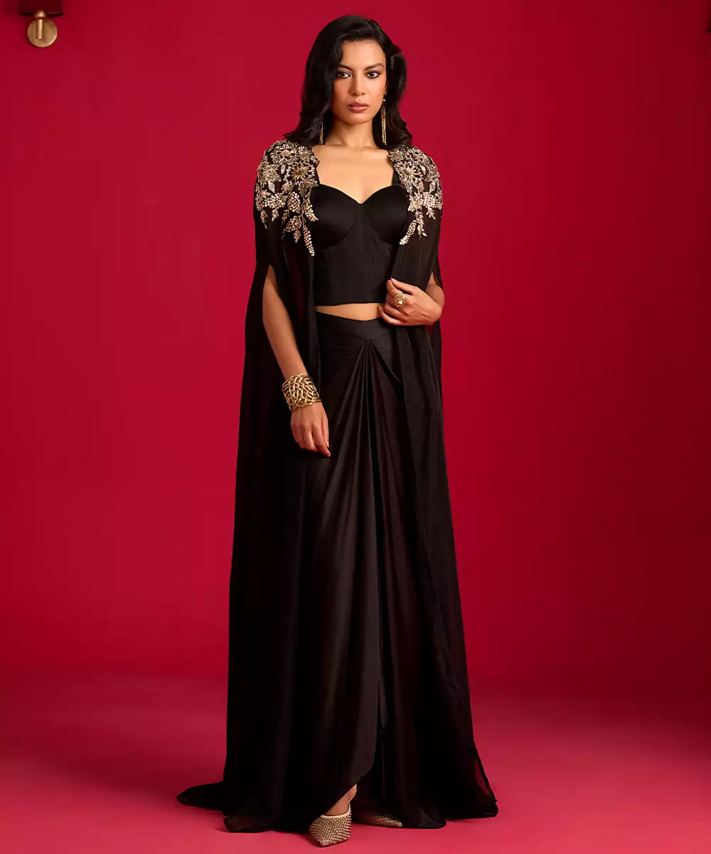 This Black Embroidered Satin Co Ord Set With Jacket Radiates Modern Sophistication Through Its Smooth, Lustrous Fabric And Elegant Fit. Intricate Embroidery Adds A Festive, Refined Touch, While The Coordinating Pieces Paired With A Stylish Jacket Create A Polished Layered Look. Perfect For Parties And Special Occasions, It Offers Timeless, Contemporary Charm.