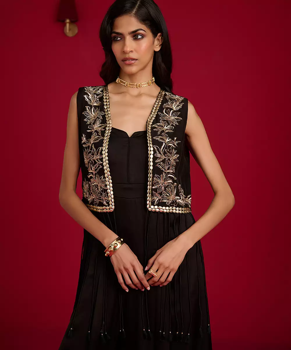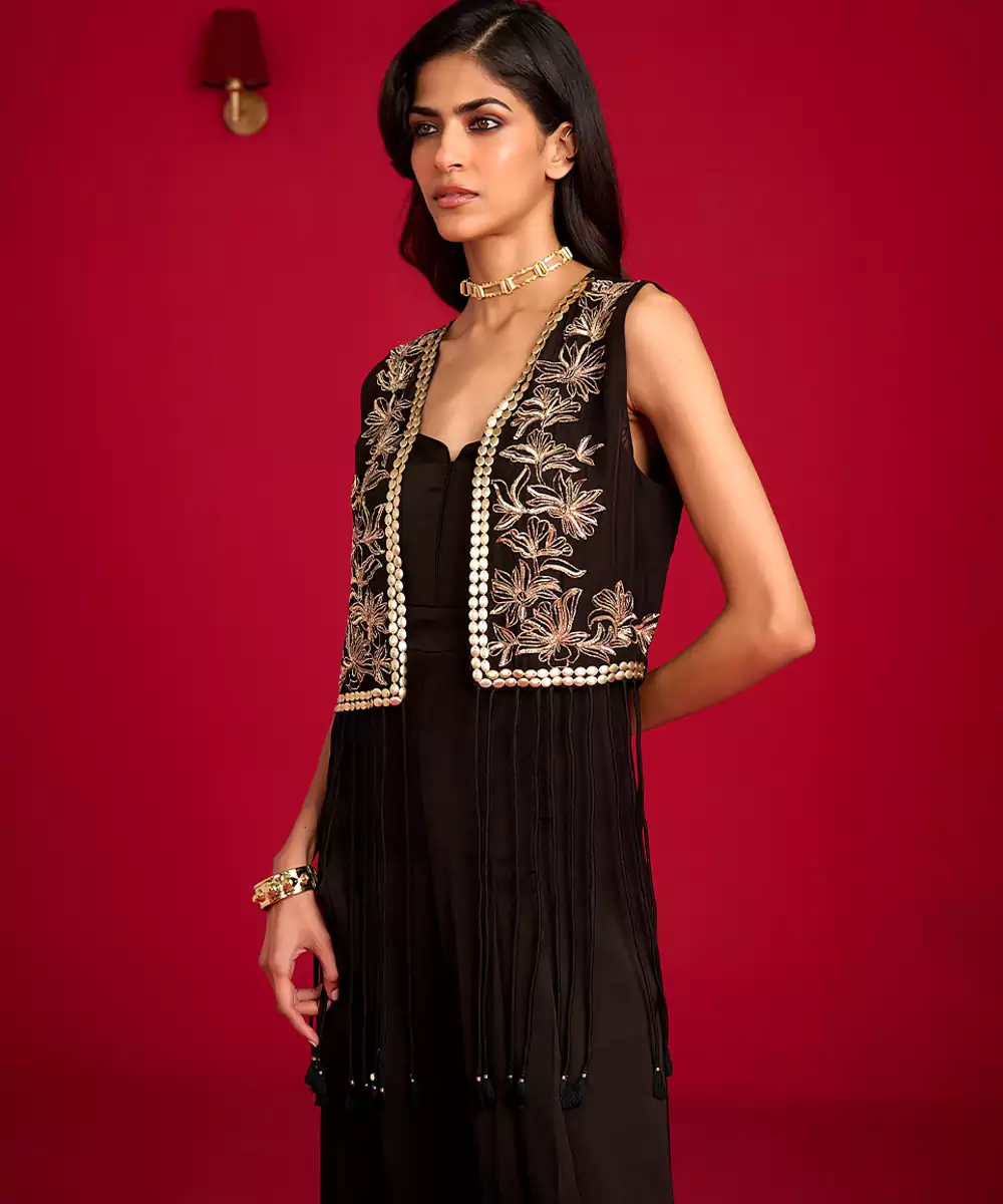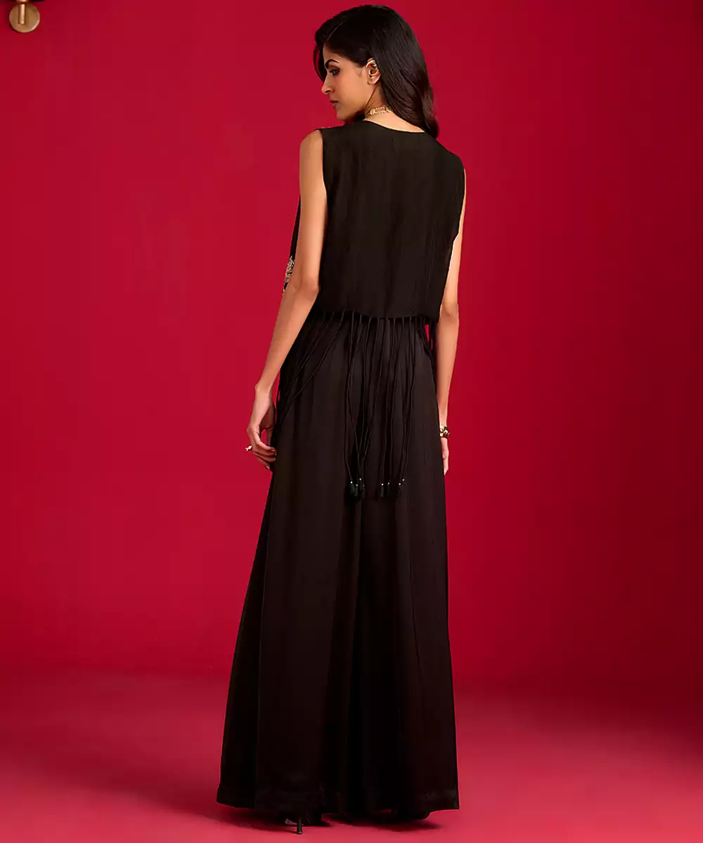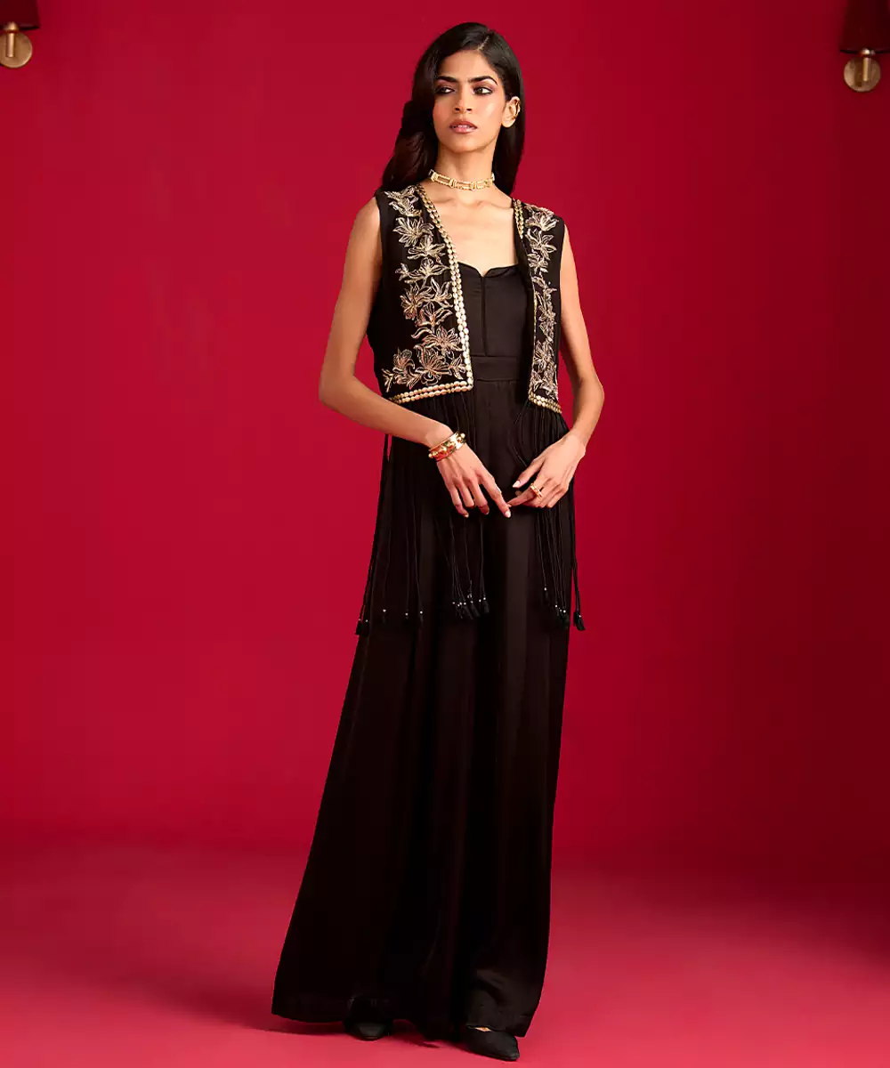 This Black Embroidered Satin Co Ord Set With Jacket Showcases Bold Elegance Through Its Sleek, Lustrous Fabric And Modern Silhouette. Intricate Embroidery Adds A Refined Festive Touch, While The Coordinated Ensemble Paired With A Stylish Jacket Elevates The Look. Perfect For Parties And Celebrations, It Blends Comfort With Sophisticated, Contemporary Charm.