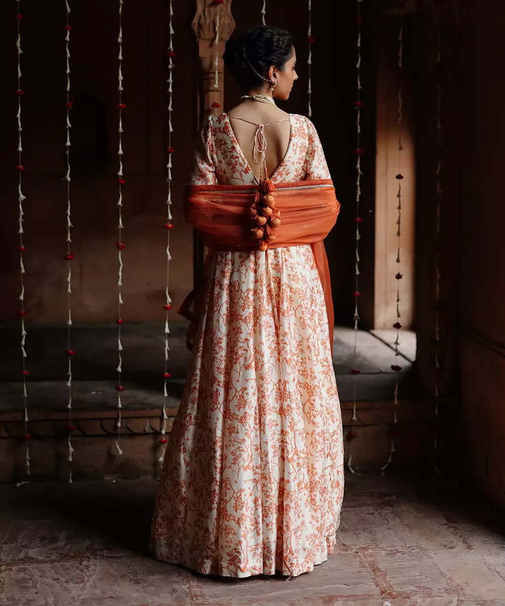 Featuring A Cream And Orange Printed Silk Anarkali With Dori, Sequin And Zardosi Embroidery On Sleeves Paired With Pure Organza Dupatta.