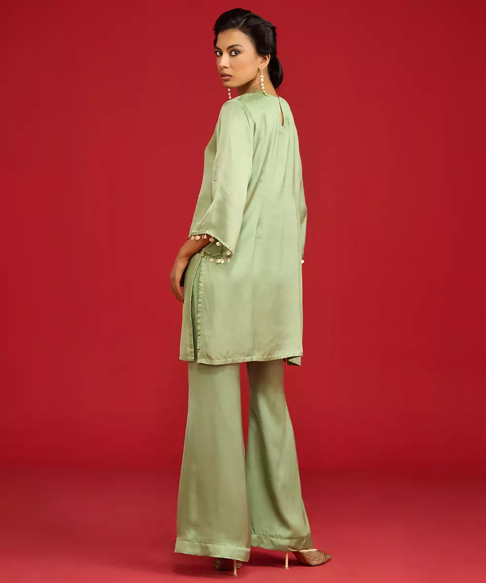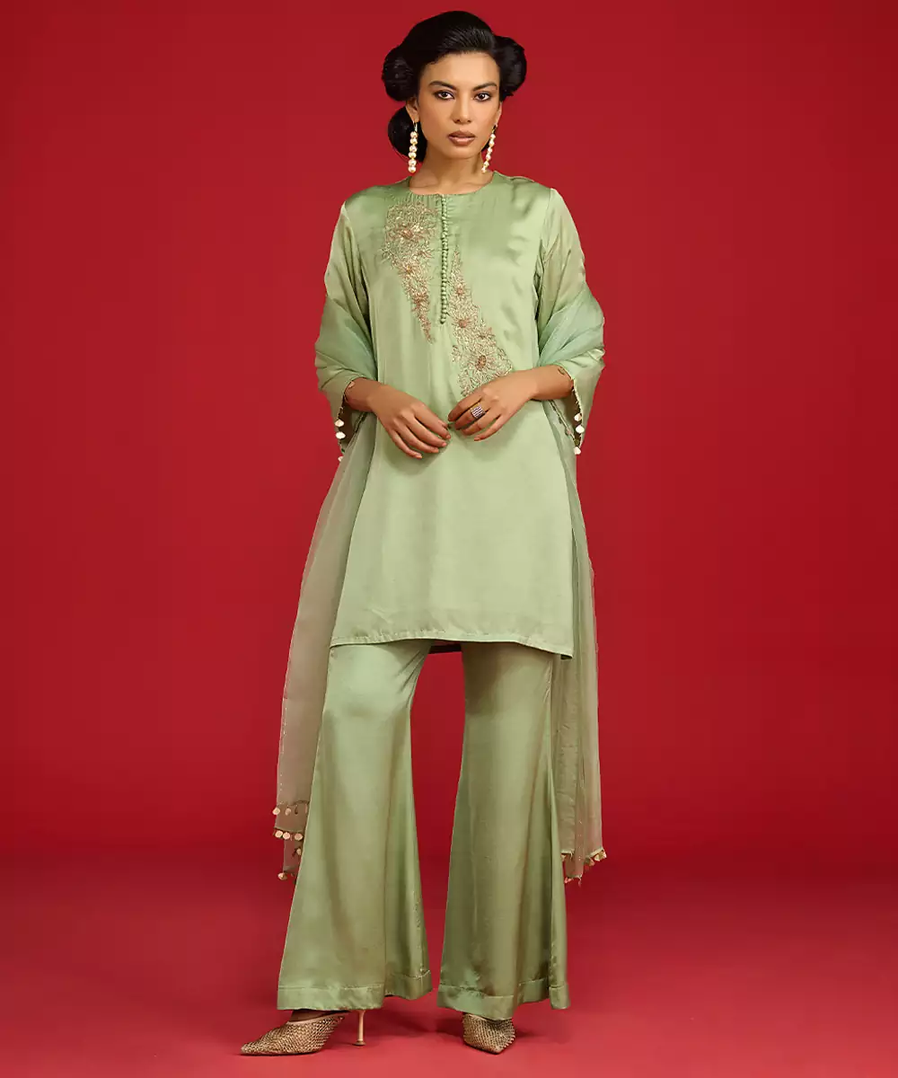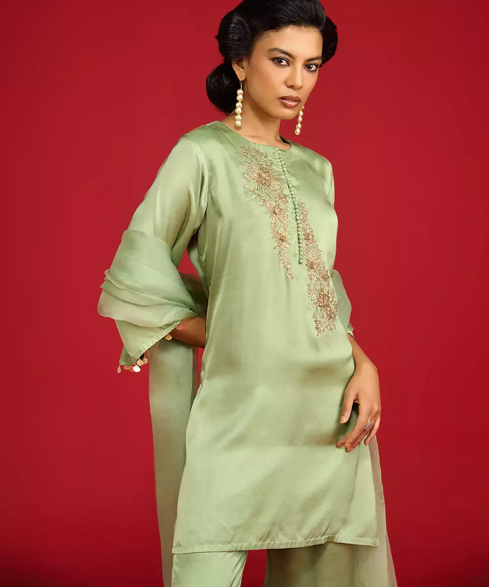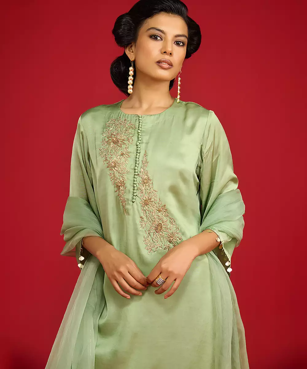 This Green Embroidered Satin Kurta Set Exudes Luxurious Charm With Its Smooth, Glossy Finish And Delicate Detailing. Intricate Embroidery Enhances Its Festive Appeal, While The Soft Satin Fabric Drapes Beautifully For An Elegant Silhouette. Perfect For Weddings, Parties, And Special Occasions, It Offers A Graceful Blend Of Comfort, Sophistication, And Modern Ethnic Style.