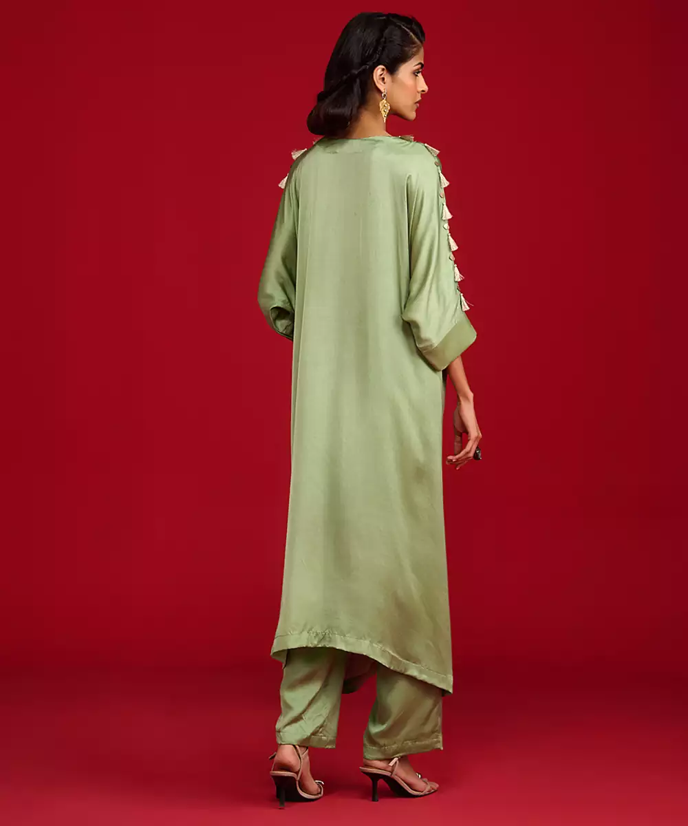 This Green Embroidered Satin Kurta Set Exudes Luxurious Charm With Its Smooth, Glossy Finish And Delicate Detailing. Intricate Embroidery Enhances Its Festive Appeal, While The Soft Satin Fabric Drapes Beautifully For An Elegant Silhouette. Perfect For Weddings, Parties, And Special Occasions, It Offers A Graceful Blend Of Comfort, Sophistication, And Modern Ethnic Style.