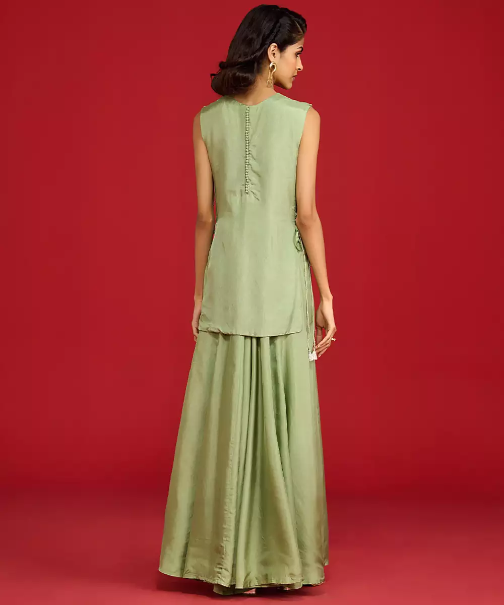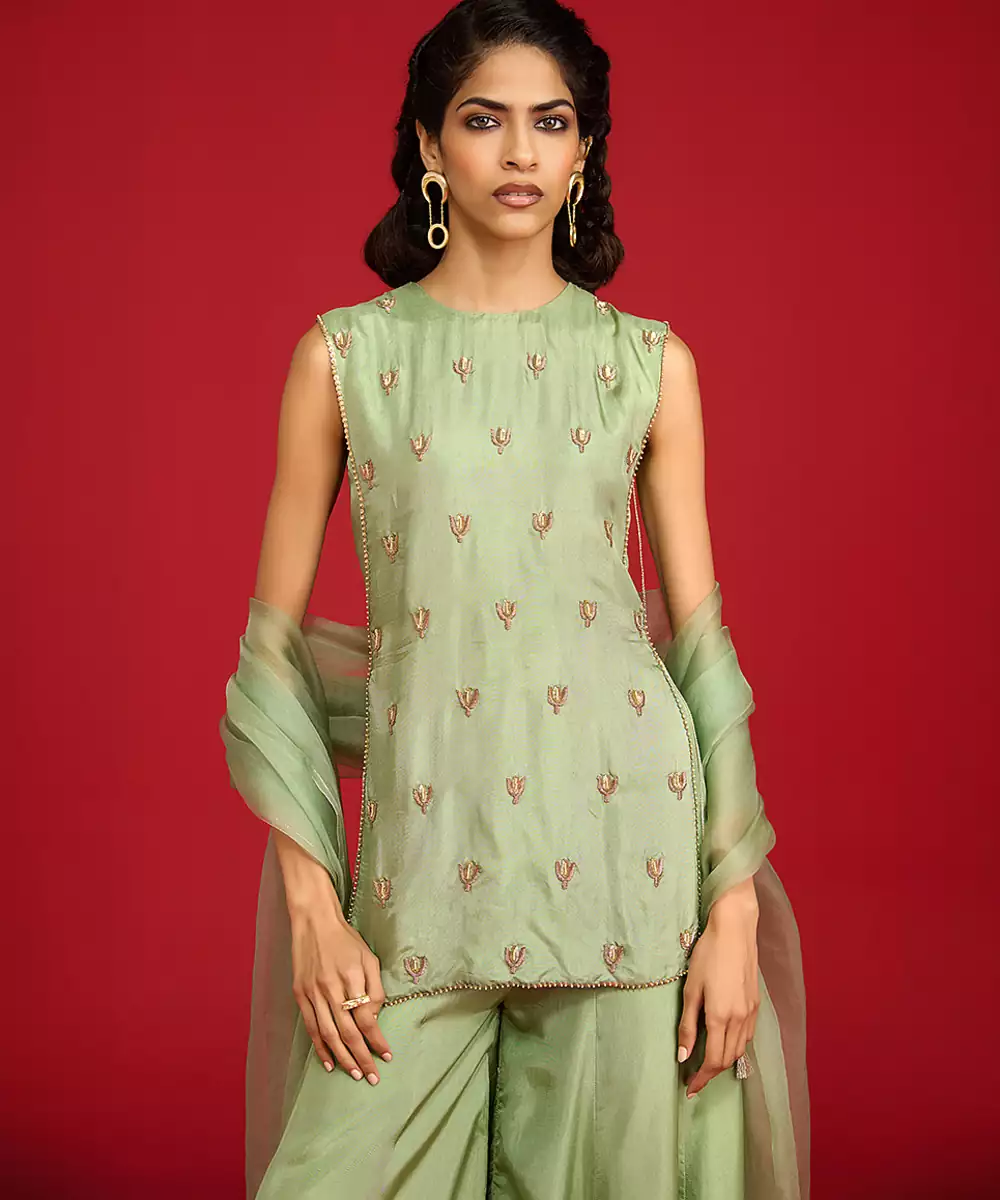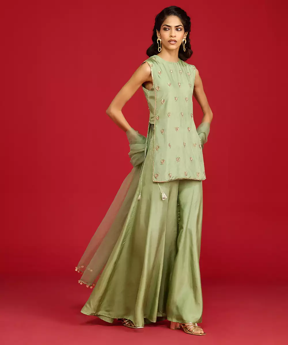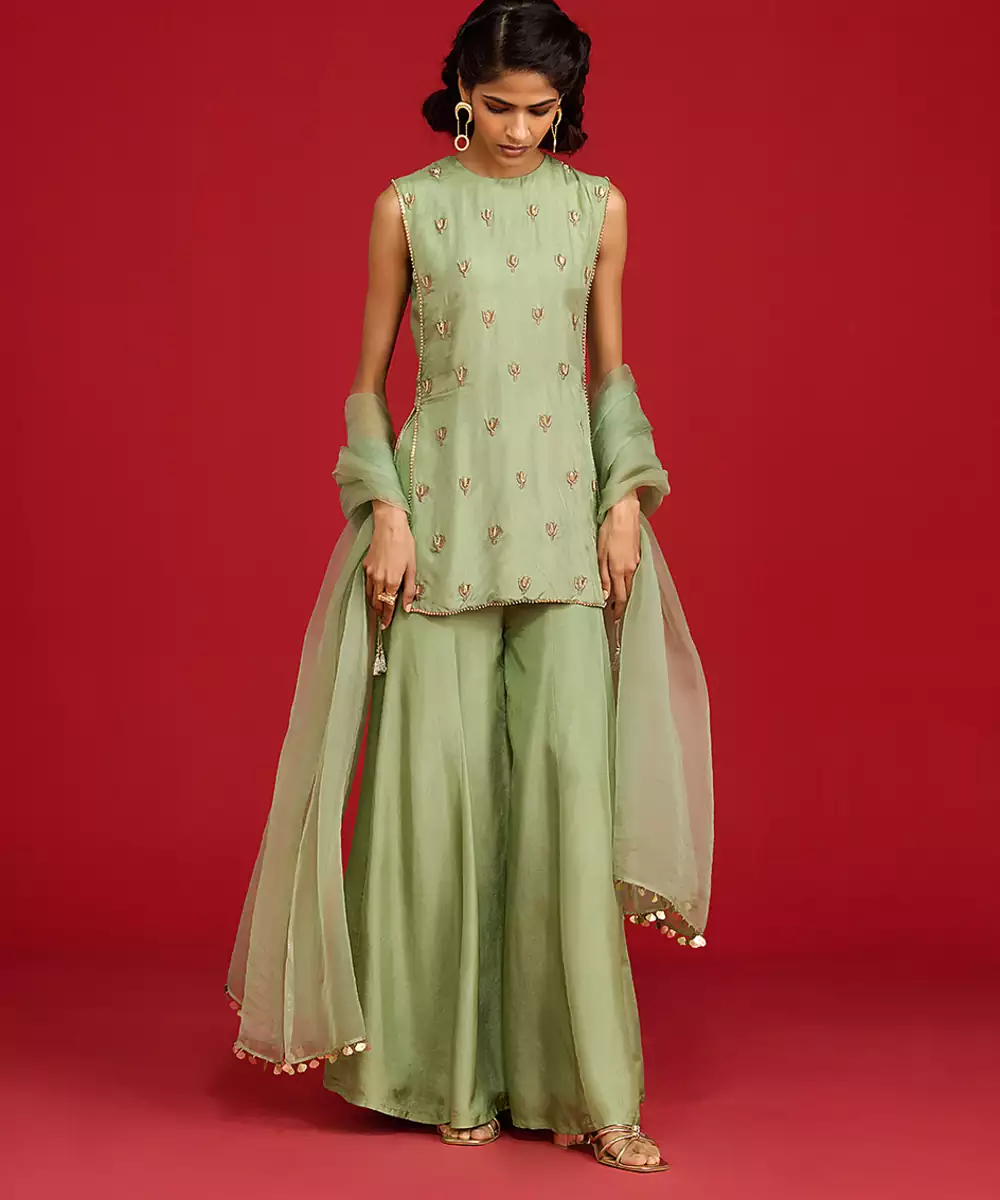 This Green Embroidered Silk Sharara Set Exudes Timeless Elegance With Its Rich, Lustrous Fabric And Intricate Detailing. The Finely Crafted Embroidery Enhances Its Festive Charm, While The Flowing Sharara Adds Graceful Movement. Perfect For Weddings, Celebrations, And Special Occasions, It Blends Luxury, Comfort, And Traditional Sophistication In A Stunning Ethnic Ensemble.