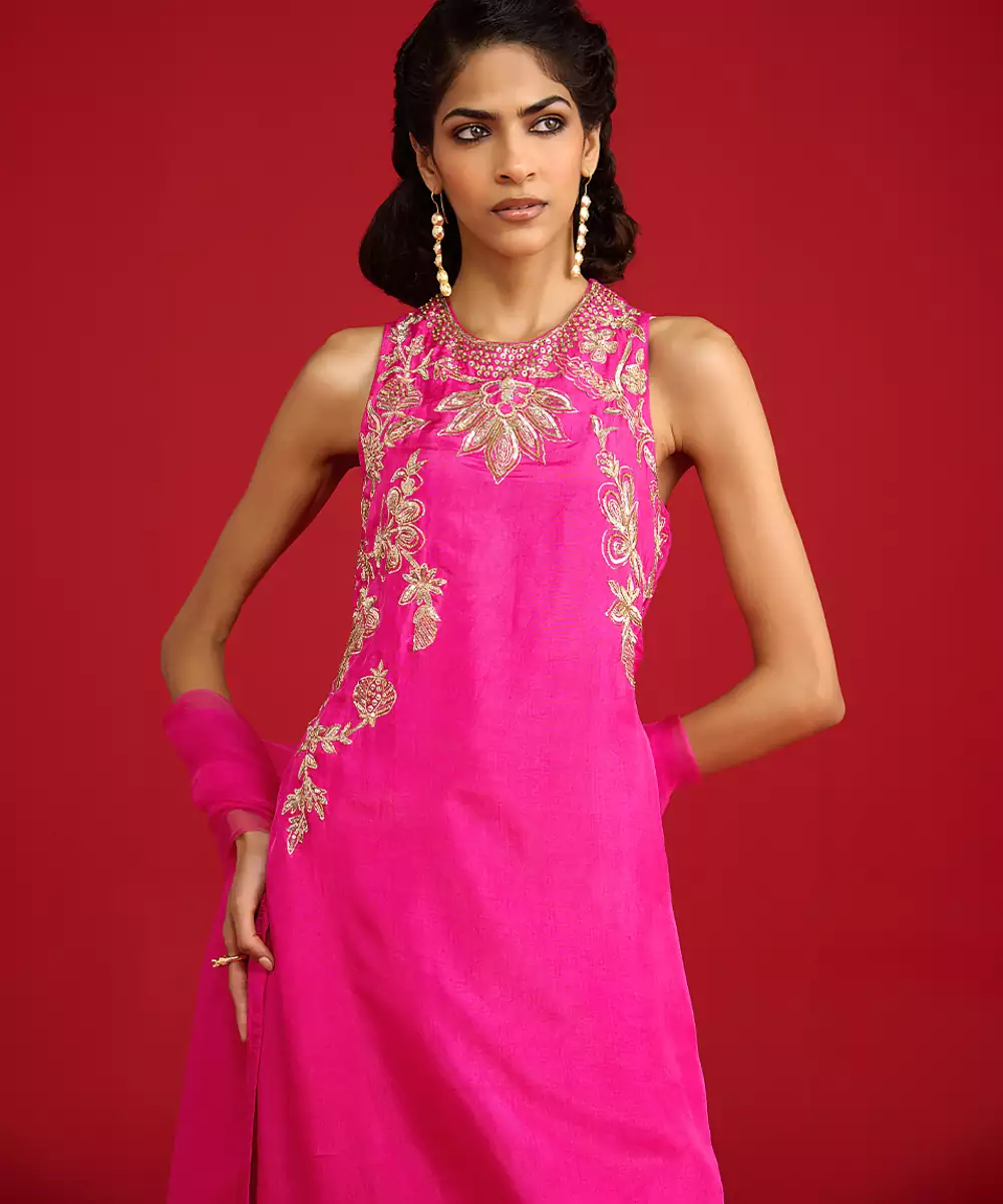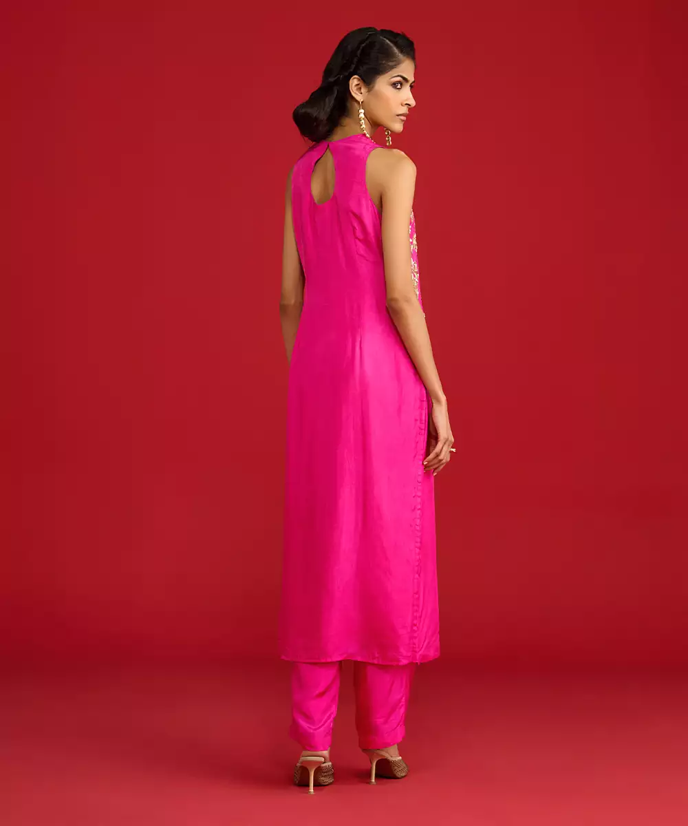 This Pink Embroidered Silk Kurta Set Exudes Timeless Elegance With Its Luxurious Sheen And Intricate Detailing. The Delicate Embroidery Enhances Its Festive Charm, While The Soft Silk Fabric Ensures Comfort And Sophistication. Perfect For Weddings, Celebrations, And Special Occasions, It Offers A Graceful, Refined Look That Beautifully Blends Tradition With Modern Style.