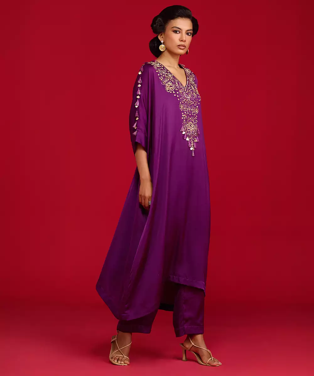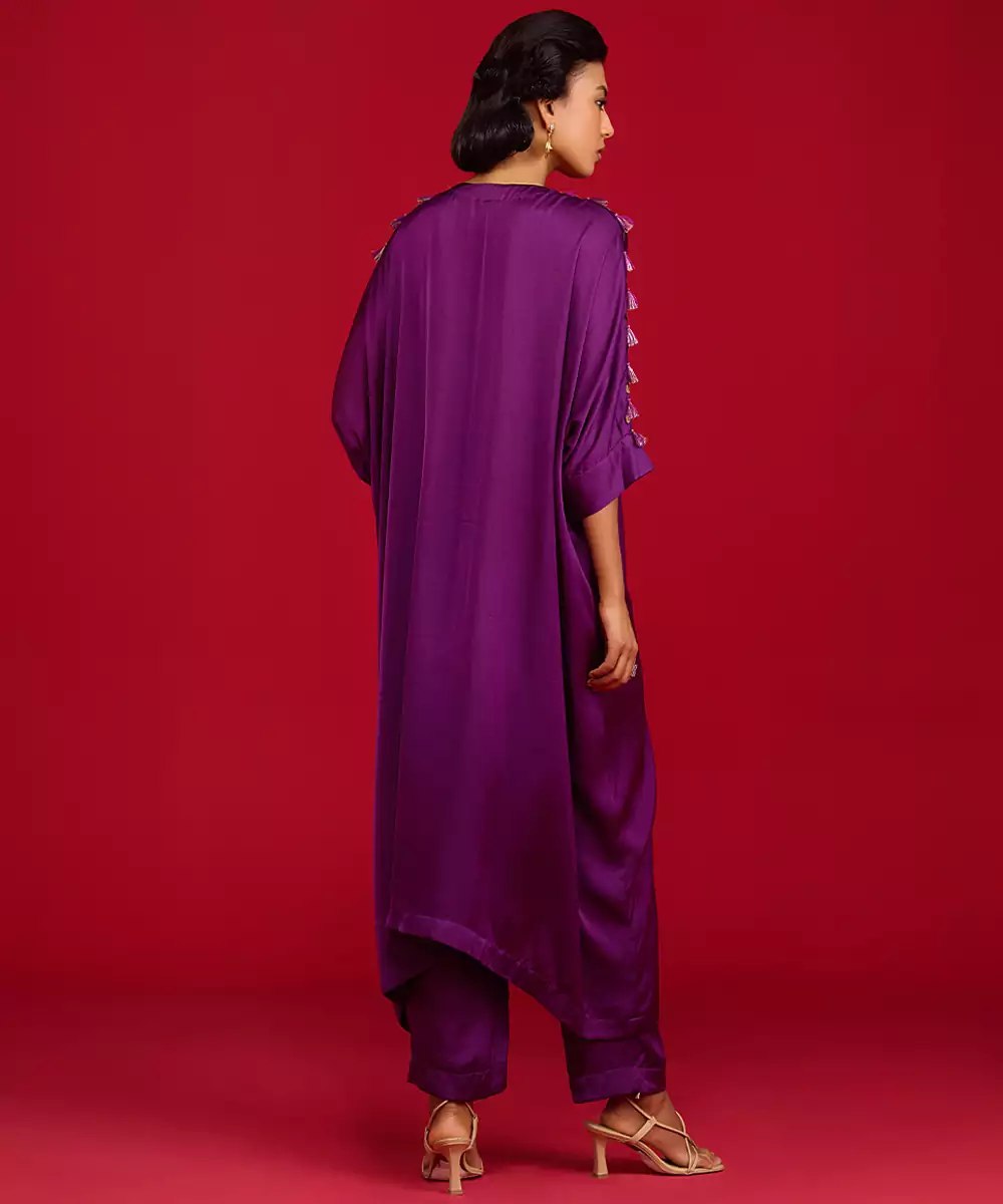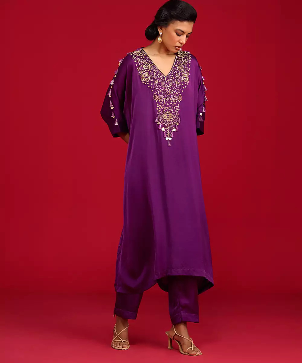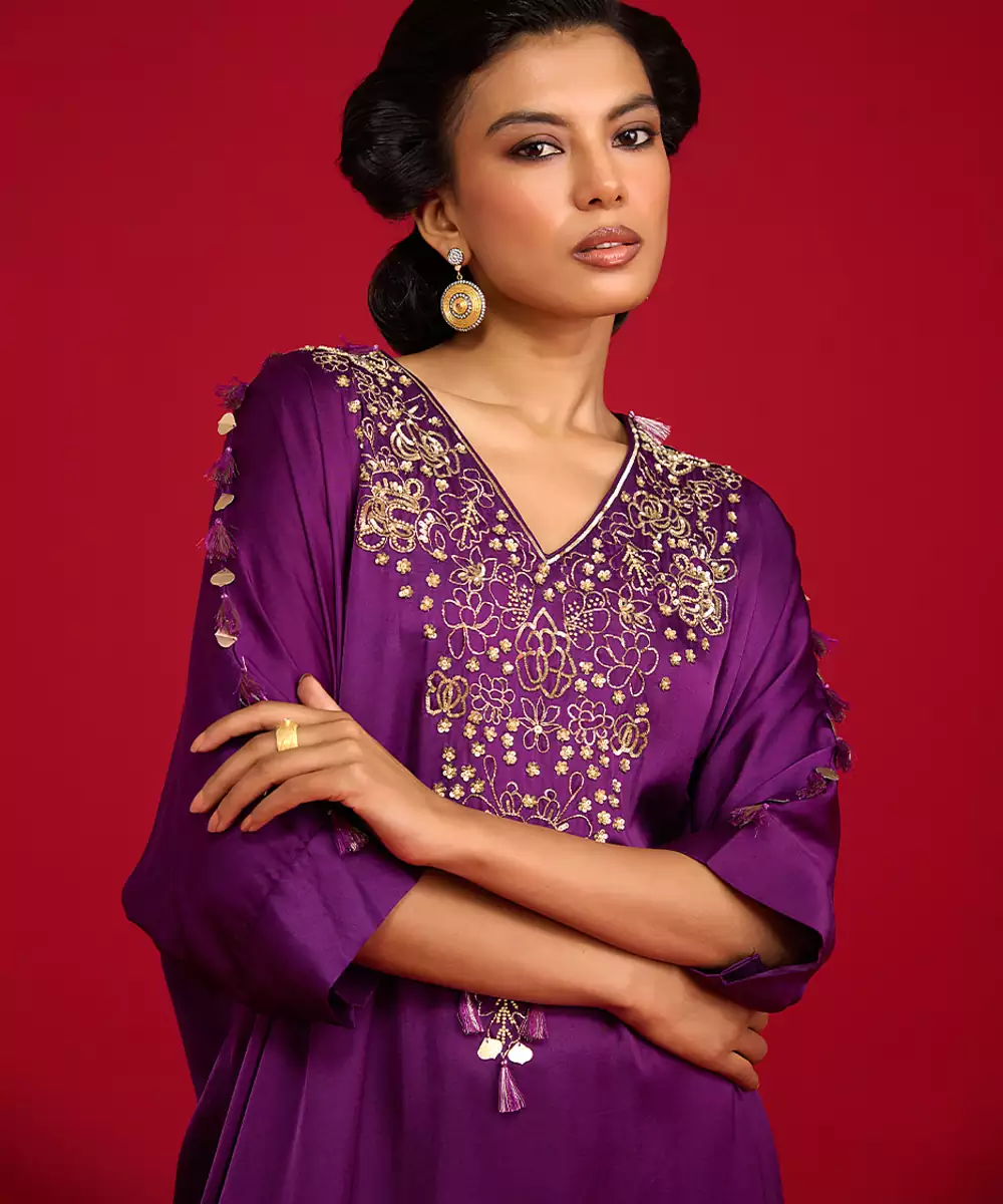 This Purple Embroidered Satin Kurta Set Exudes Luxurious Charm With Its Smooth, Glossy Finish And Delicate Detailing. Intricate Embroidery Enhances Its Festive Appeal, While The Soft Satin Fabric Drapes Beautifully For An Elegant Silhouette. Perfect For Weddings, Parties, And Special Occasions, It Offers A Graceful Blend Of Comfort, Sophistication, And Modern Ethnic Style.