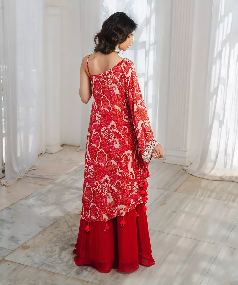 One Shoulder Kaftan With Pearl And Mirror Work Embroidery Detailing Paired With Solid Gathered Skirt. It Comes With A Lycra Bustier. .