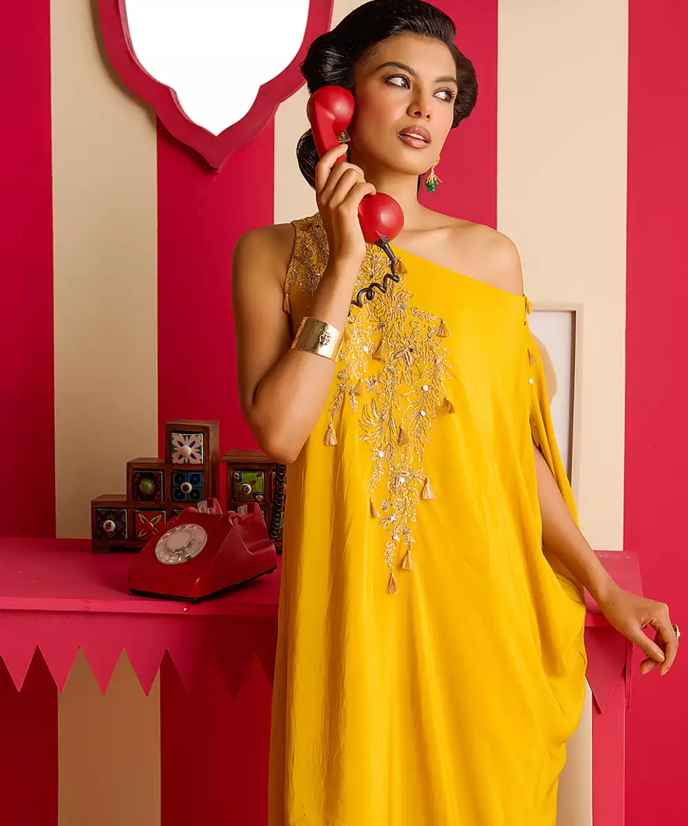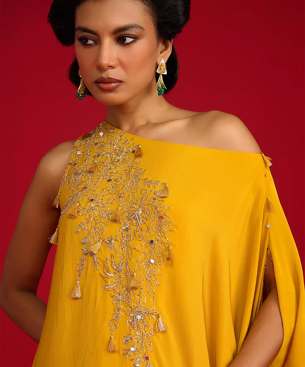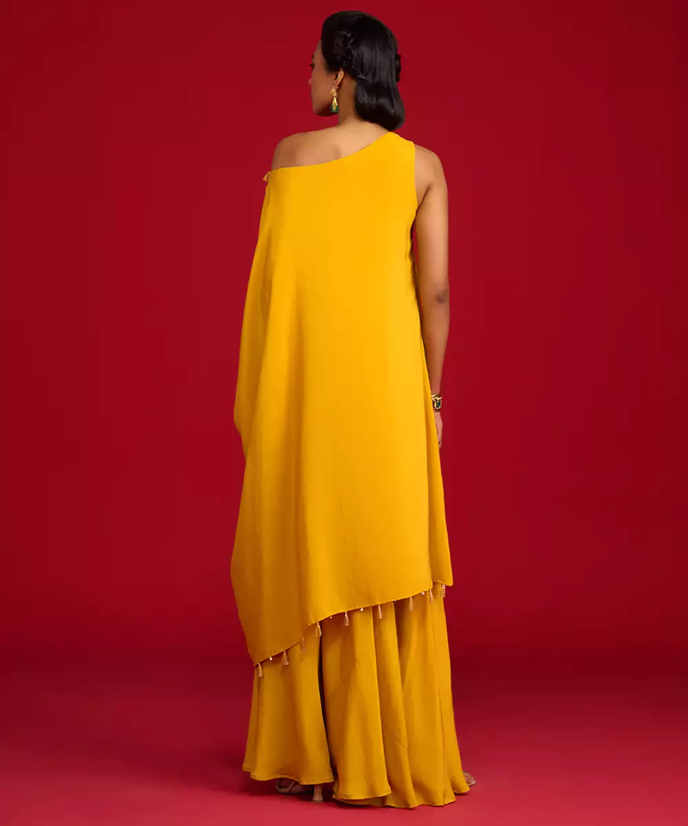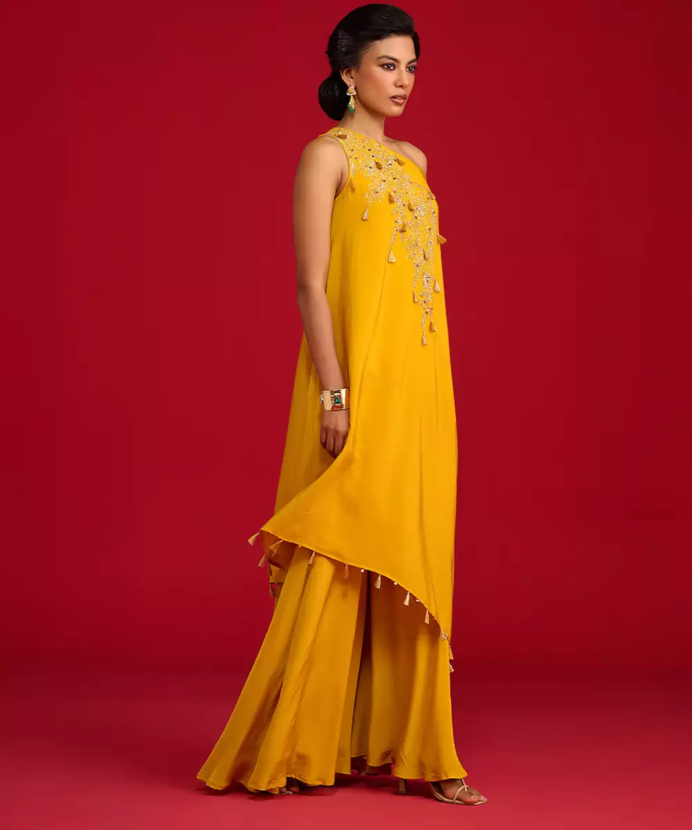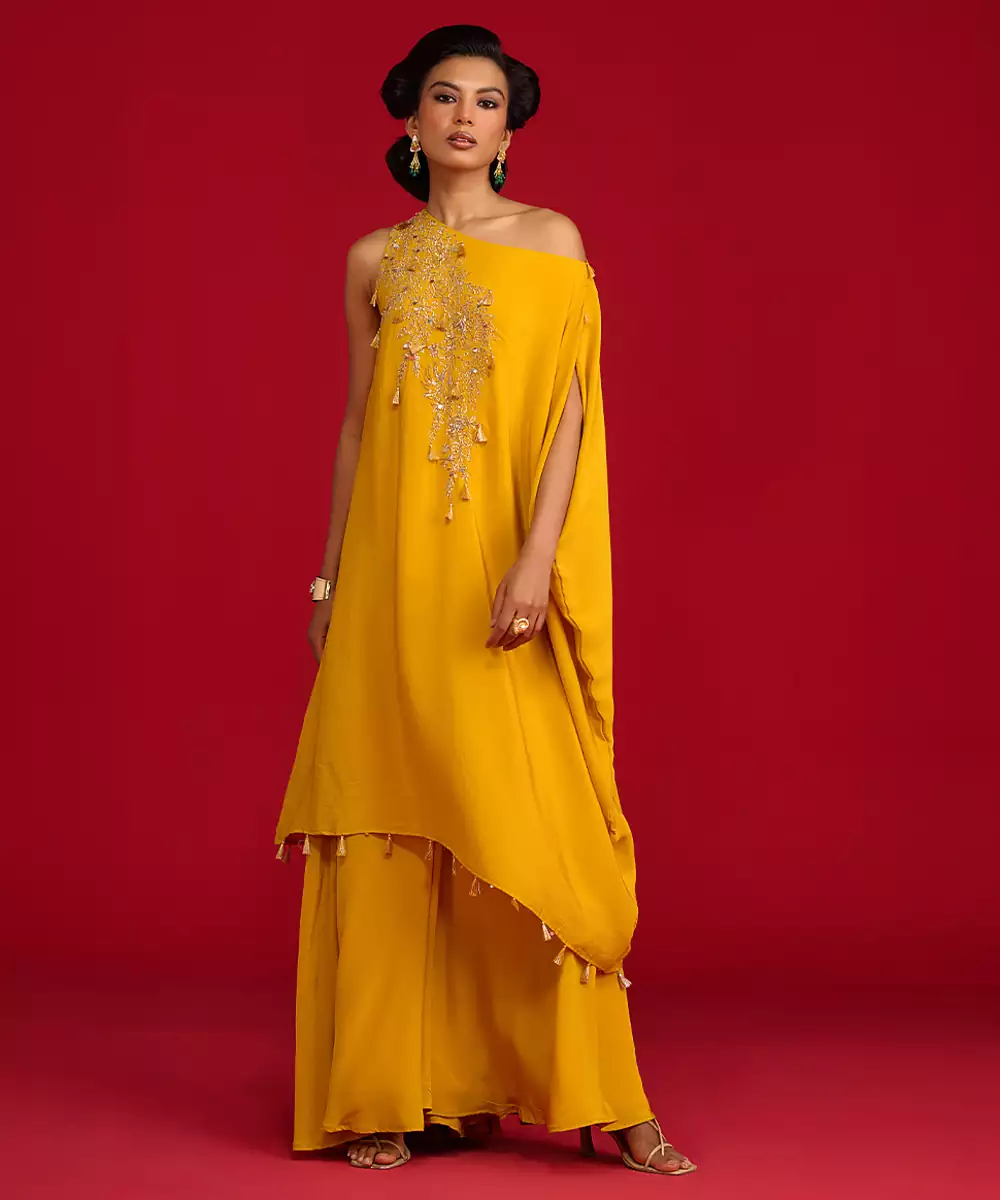 This Yellow Embroidered Crepe Kurta Set Blends Elegance With Effortless Comfort. Crafted From Soft, Flowy Crepe, It Features Intricate Embroidery That Adds A Refined Festive Touch. The Lightweight Fabric Enhances Movement, Ensuring A Flattering Silhouette. Perfect For Celebrations, Gatherings, And Special Occasions, It Offers A Stylish Balance Of Tradition And Contemporary Charm.