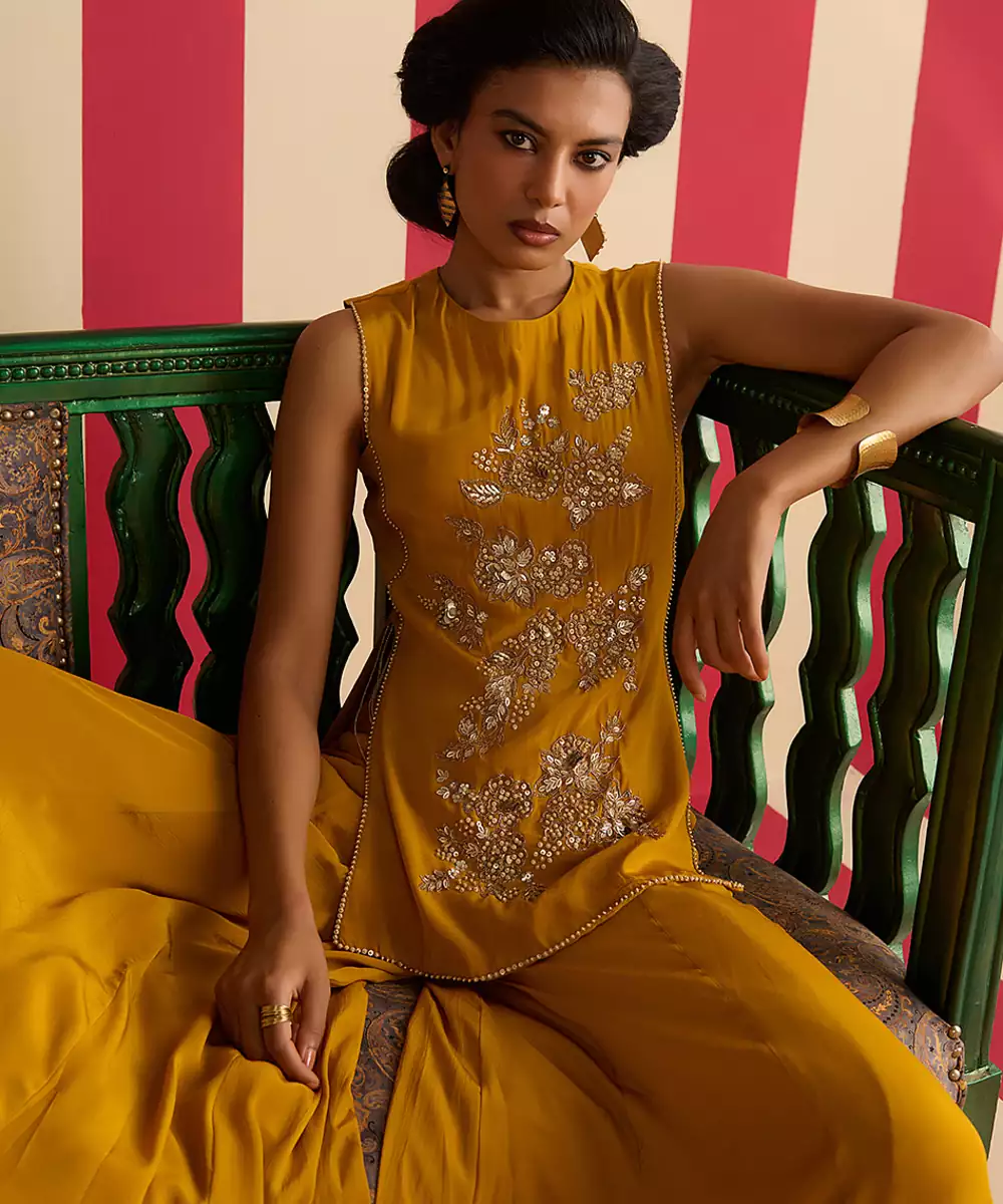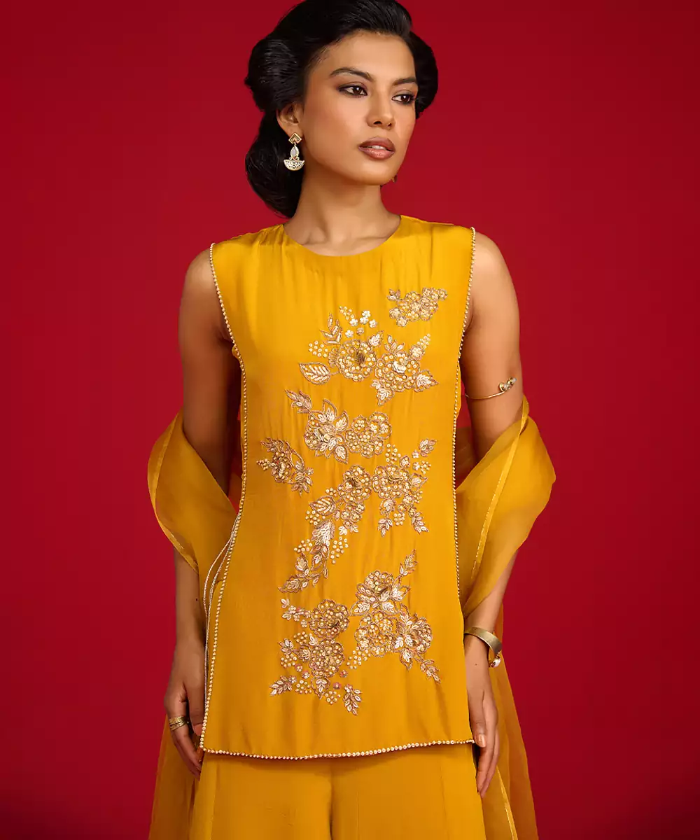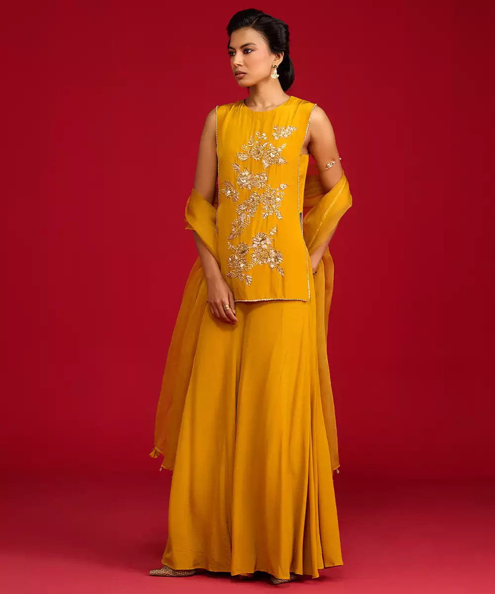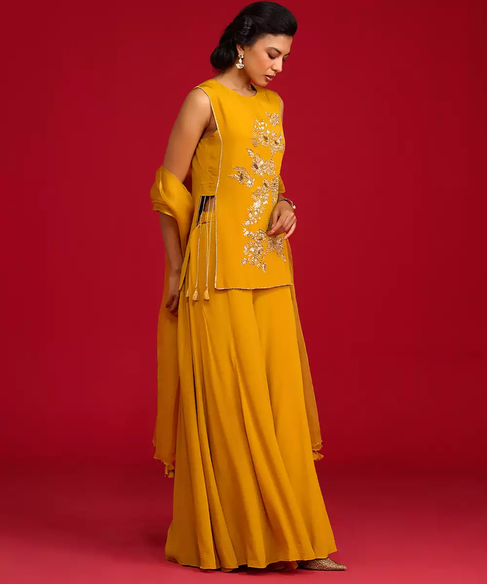 This Yellow Embroidered Crepe Sharara Set Exudes Graceful Charm With Its Smooth, Flowy Silhouette And Rich Hue. Intricate Embroidery Enhances Its Festive Elegance, While The Lightweight Crepe Fabric Ensures Comfort And Effortless Movement. Perfect For Weddings, Celebrations, And Special Events, It Blends Traditional Detailing With Contemporary Sophistication For A Stunning Ethnic Look.
