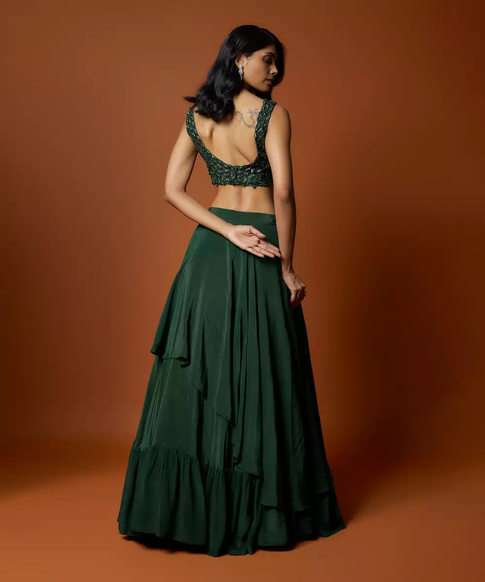 Featuring A Forest Green Asymmetrical Lehenga In Crepe And Organza Base. It Is Paired With An Embroidered Choli And An Organza Dupatta.