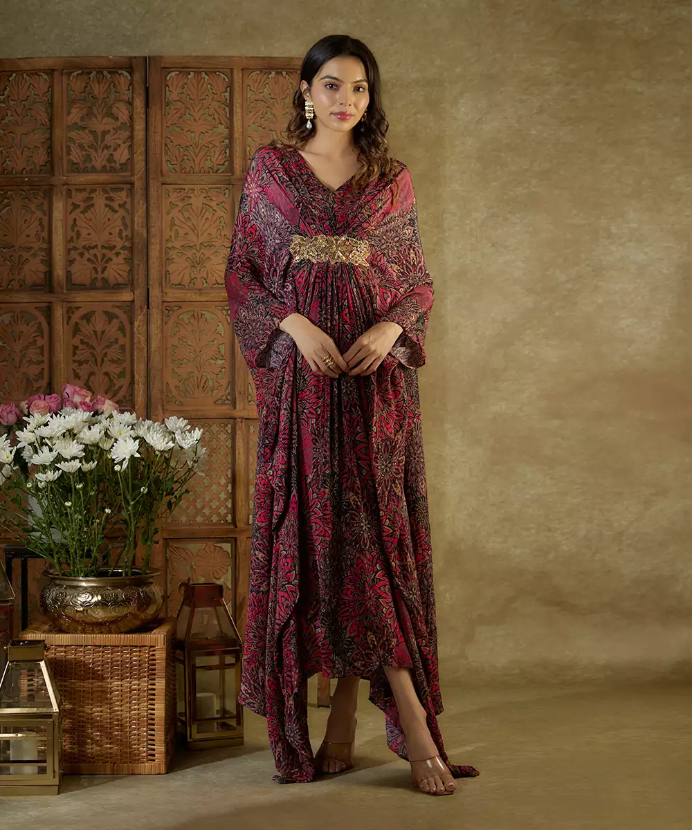 Pink Printed Kaftan Featuring An Embroidery Detailing At The Waist. Colour: Pink Fabric: Crepe Components: 1 Dress Work: Printed
