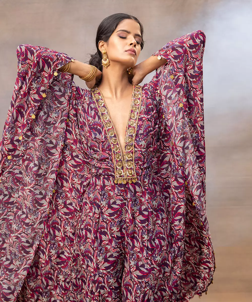Purple Geometric Printed Jumpsuit Features A Gold Embroidery Adorning The Neckline And Hangings On The Sleeves Edges.