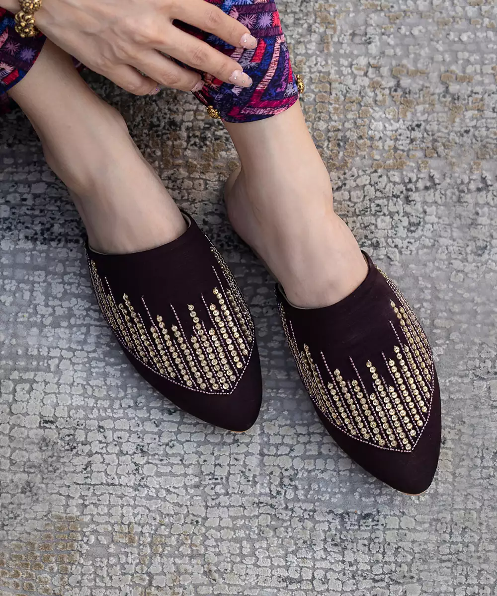 Pristine Pair Of Mules In A Deep Wine Tone With Arch Shaped Gold Sequin Details For Your Next Big Ceremony Or Art Gallery Visit. Hand Embroidered By Local Artisans.