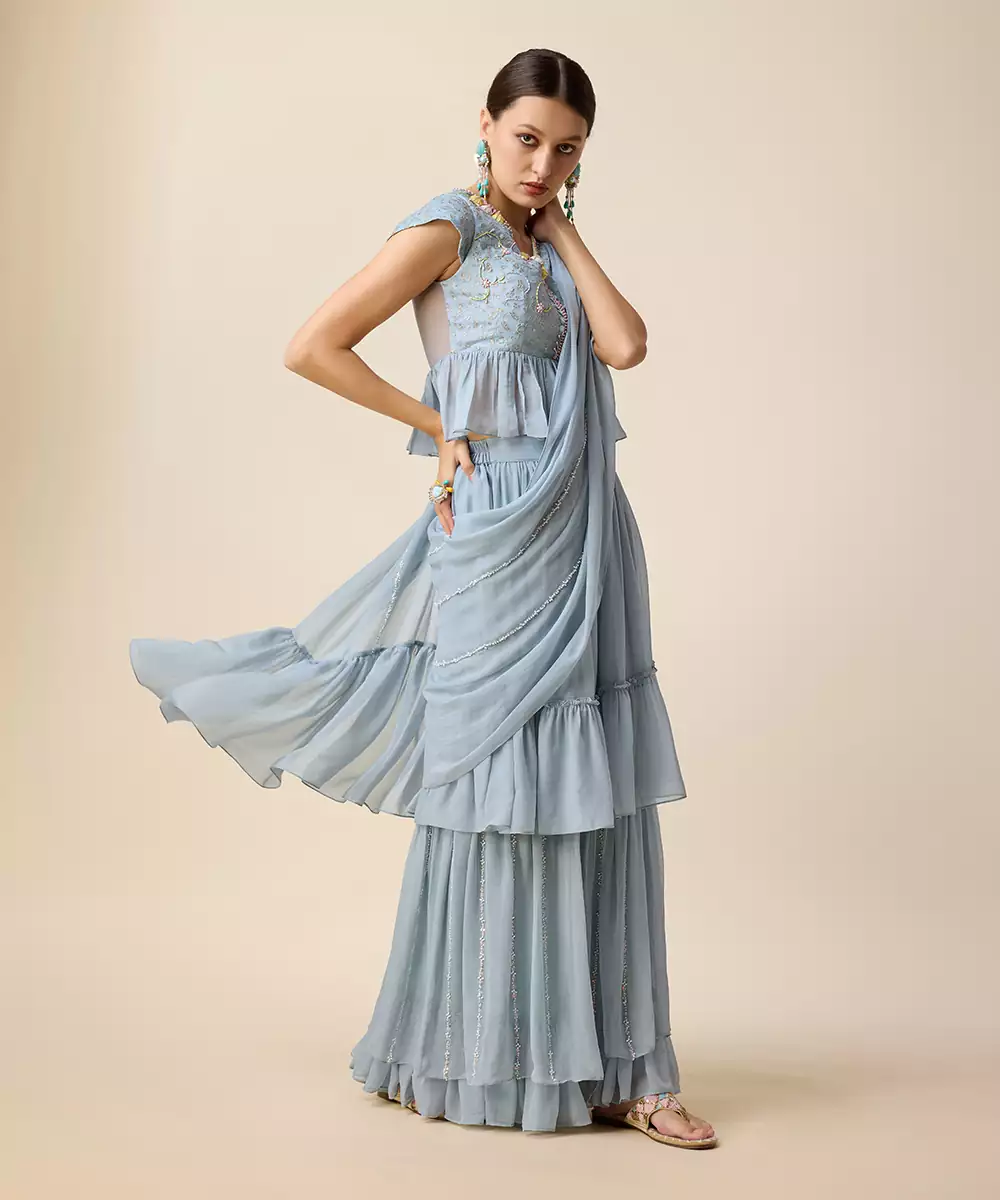 Featuring A Light Blue Sharara Saree With Cutdana, Moti Embroidery In Stripe Pattern On Detachable Dupatta. Paired With Sequin, Thread Embroidered Padded Peplum Top In Leaf Pattern.