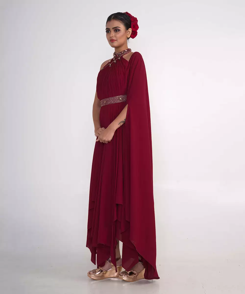 Maroon Draped Dress With Fixed Belt Features At Waist.