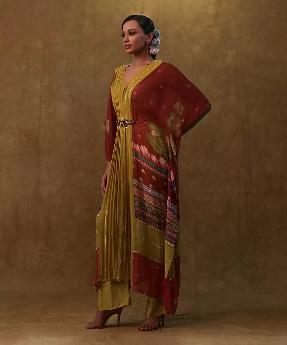 Kaftan Set Combing Maroon And Olive Green Shades Offers A Rich And Distinctive Aesthetic. Living With Sequins And Stone Work To Enhance Theor Elegance And Appeal.