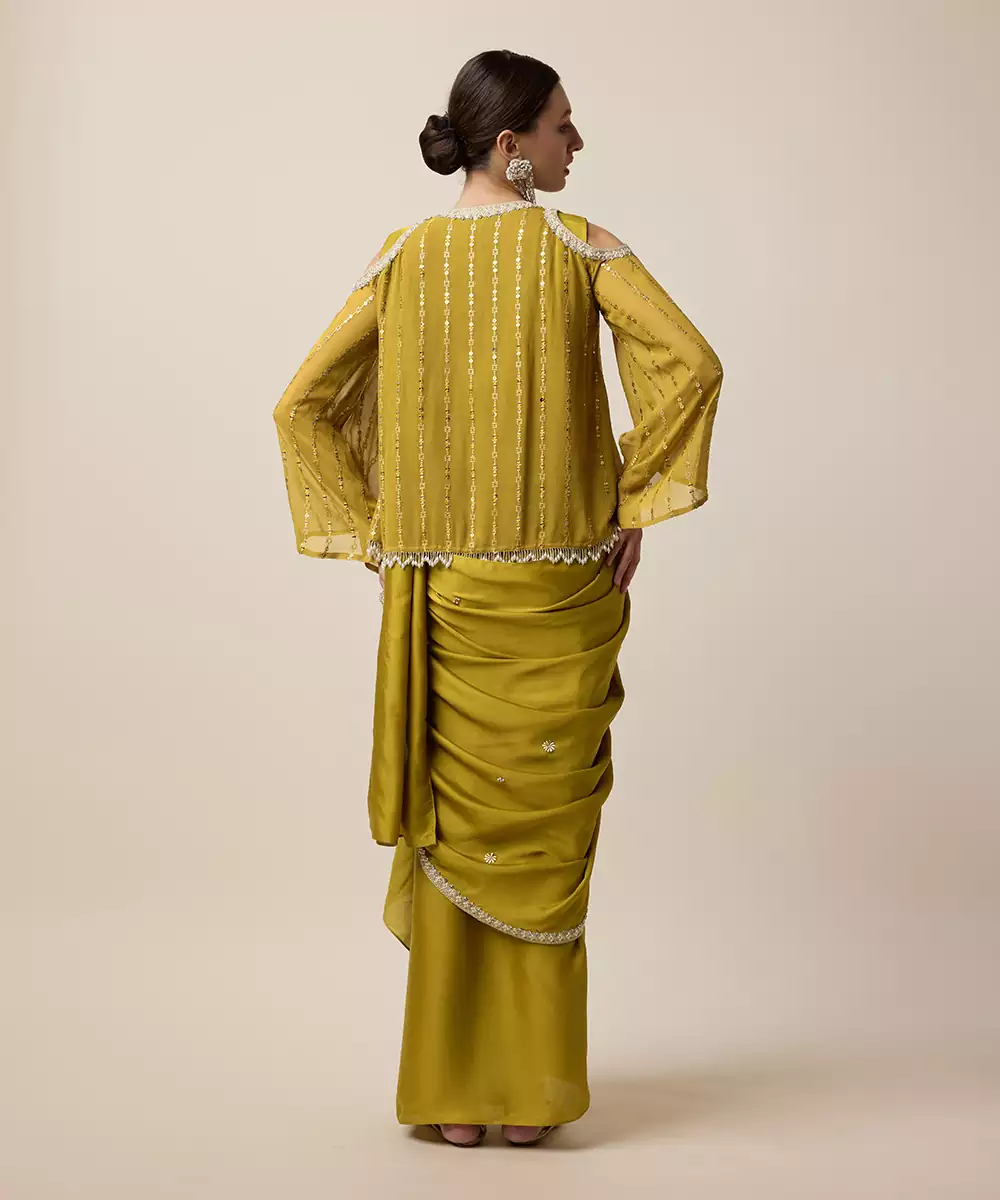 Featuring A Mustard Pre Draped Saree With Sequin, Pearl, Zari Thread Embroidery In Floral Placement Pattern. Paired With Padded Blouse, Detachable Pallu, Pearl Border Embroidered Belt & Stripe Embroidered Jacket.