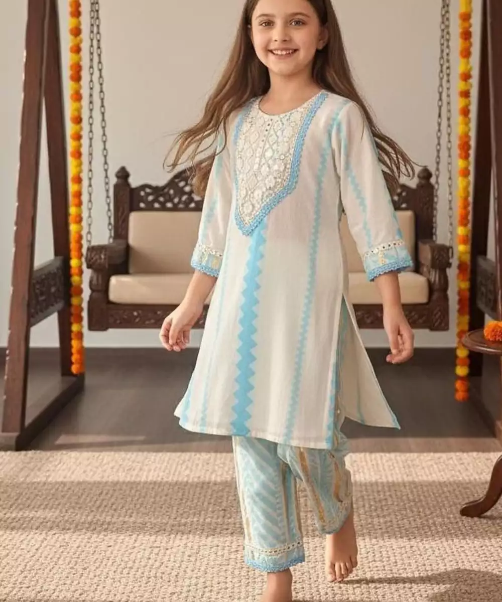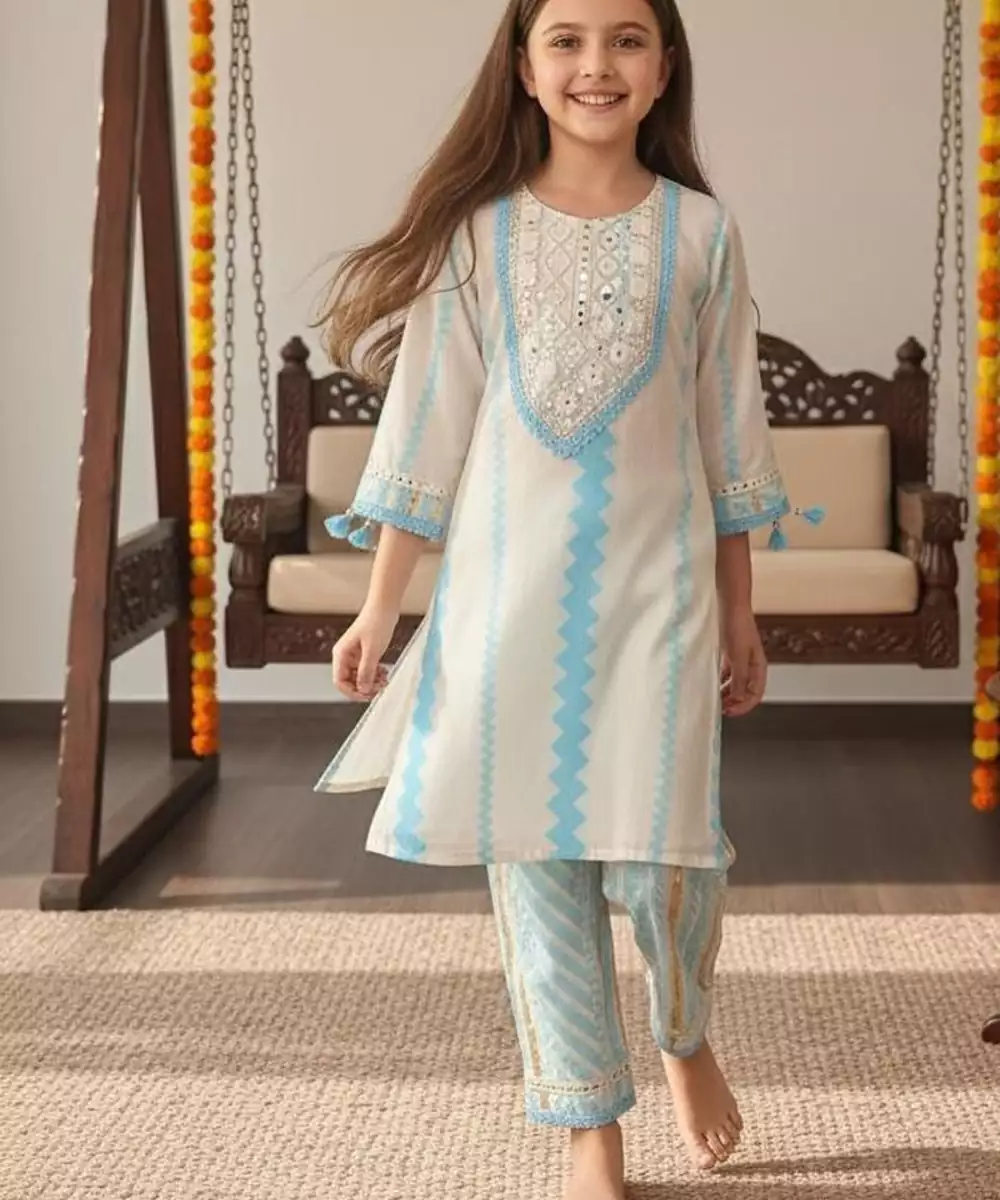 This Blue Embroidered Cotton Kurta Set Exudes Vibrant Charm And Traditional Elegance. Crafted From Breathable Cotton Fabric, It Features Intricate Multicolor Embroidery That Adds A Lively, Refined Touch. Perfect For Festive Occasions And Celebrations, It Offers All Day Comfort With Timeless Ethnic Appeal.