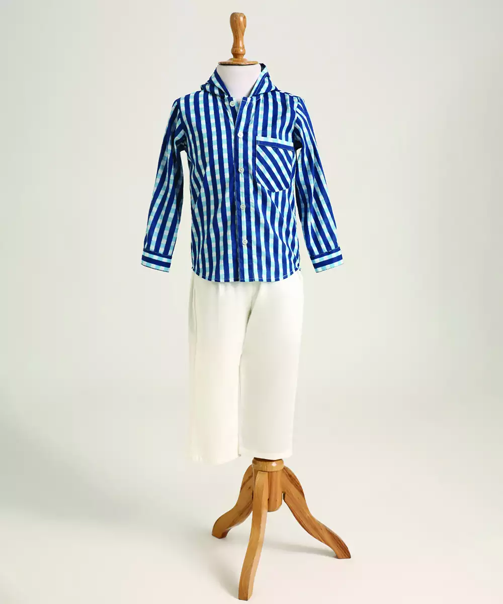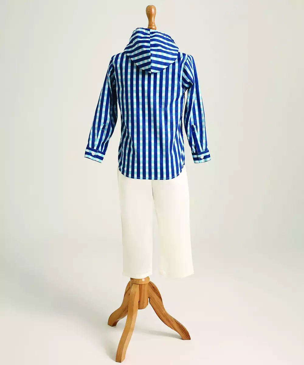 Blue Woven Cotton Hooded Shirt