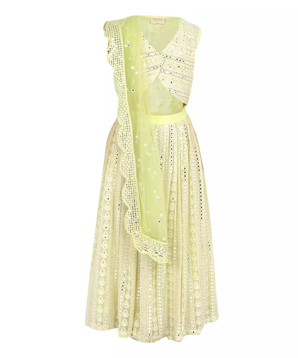 Chikankari With Faux Mirror Blouse And Lehenga With Soft Net Dupatta (Detailed With Faux Mirror Lace) Fabrics :Georgette Colour: Lime Yellow Components :1 Blouse/ 1 Lehenga / 1 Dupatta