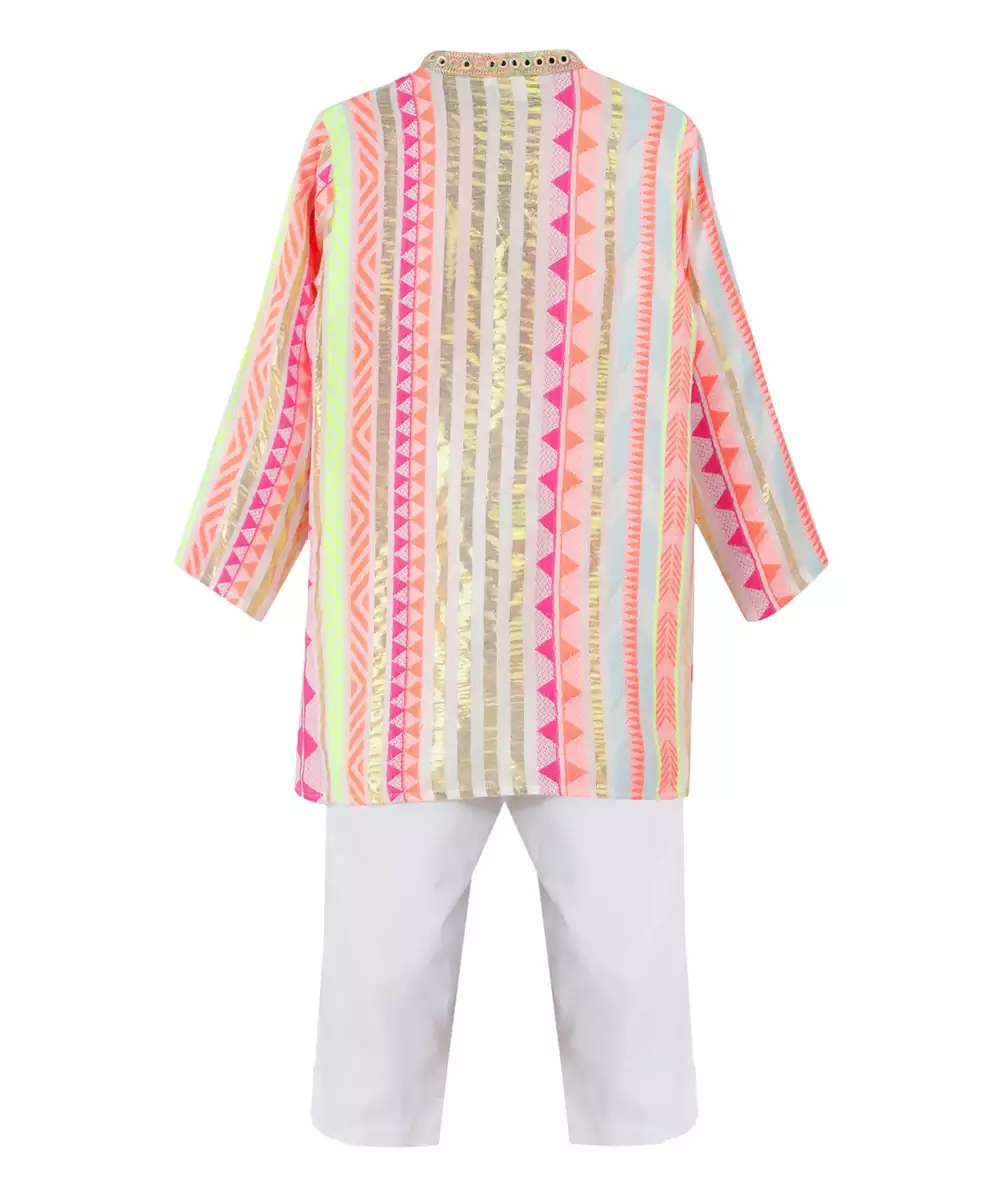 Viscose Lurex Kurta Paired With Glaze Cotton Pyjama. Detailed With Multicolor Mirror Lace Fabrics :Lurex Colour: White Components :1 Kurta / 1 Pajama
