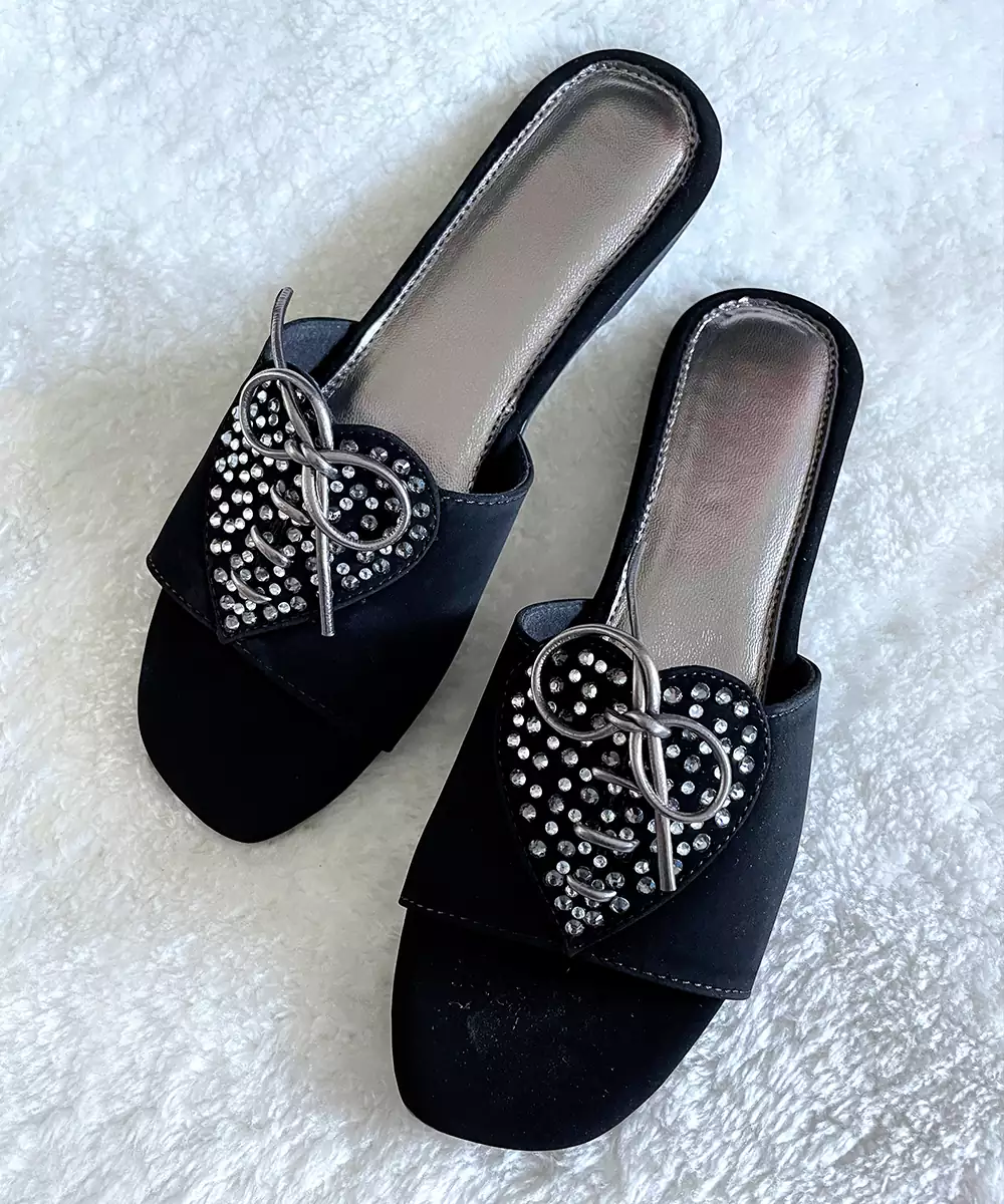 Black Flats With A Diamond Heart. This Head Turner Is Sure To Amp Up Your Outfit. Fabric Used Artificial Leather. Open Toe Style And Comes With A Soft Cushion Lining Which Makes It Extremely Comfortable And Can Be Worn For Long Hours. Our Footwear Is Vegan And Handmade By Local Artisans And Made With Utmost Love And Care!