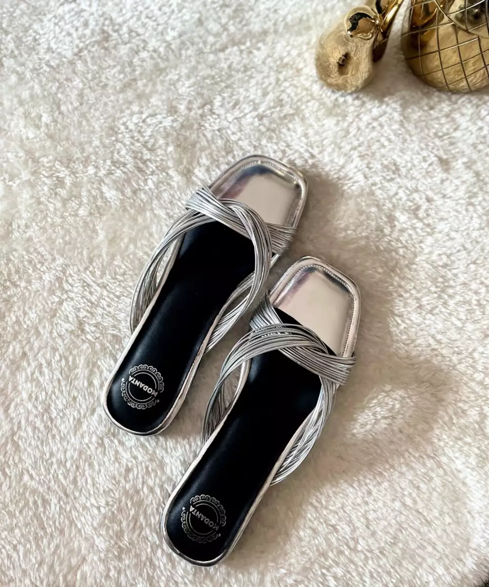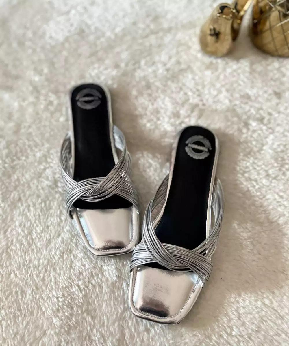 Strappy Silver Twisted Flats. Comes With A Soft Cushion Lining Which Makes It Extremely Comfortable And Can Be Worn For Long Hours. Our Footwear Is Vegan And Handmade By Local Artisans And Made With Utmost Love And Care!