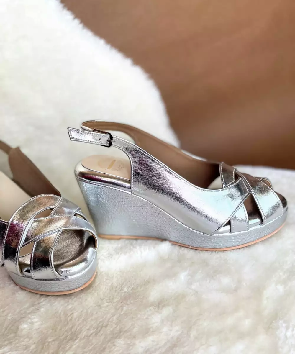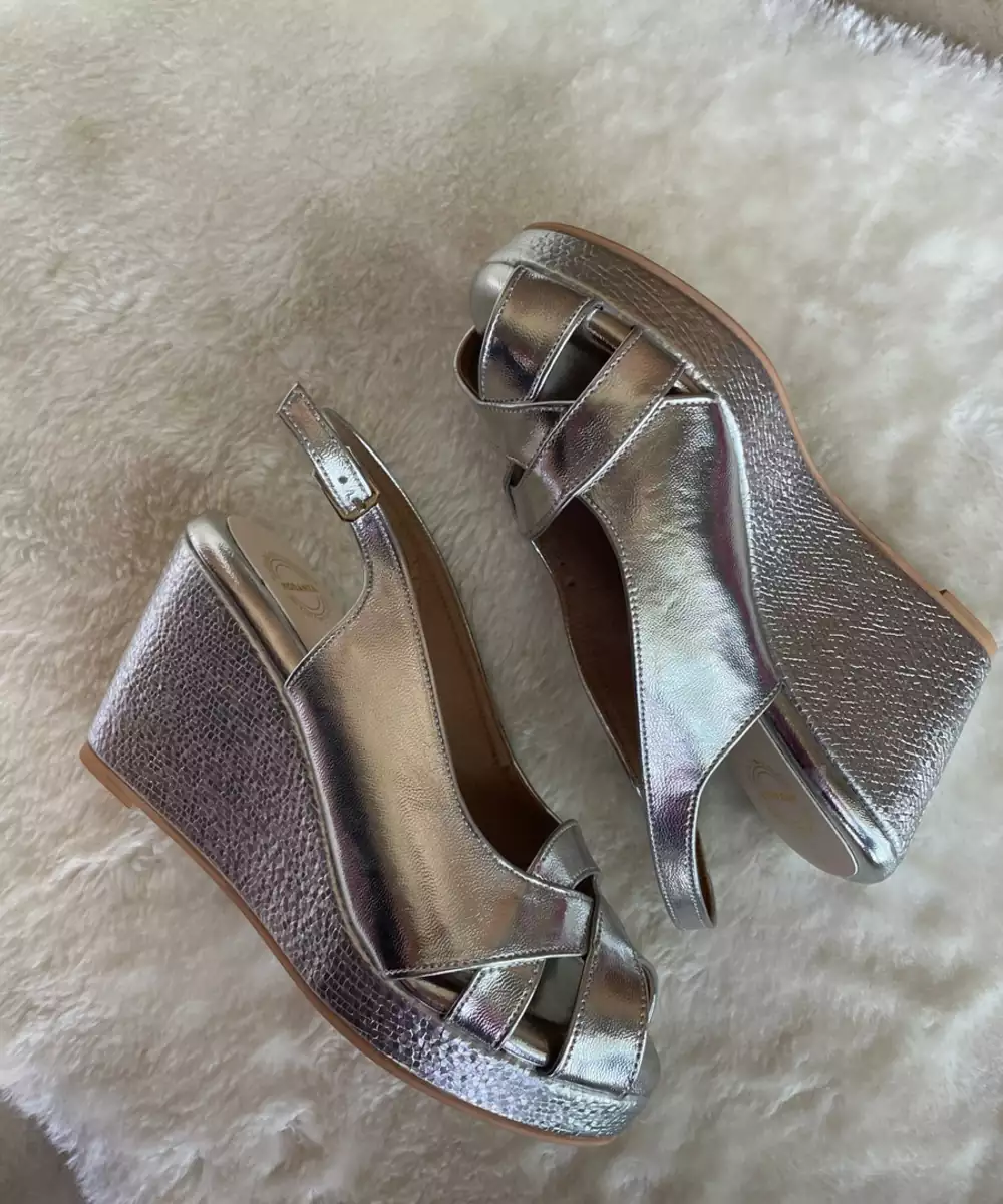 Wedges With A Unique Silver Upper And Snakeskin Heel. Open Toe Style And Comes With A Soft Cushion Lining Which Makes It Extremely Comfortable And Can Be Worn For Long Hours. Our Footwear Is Vegan And Handmade By Local Artisans And Made With Utmost Love And Care!