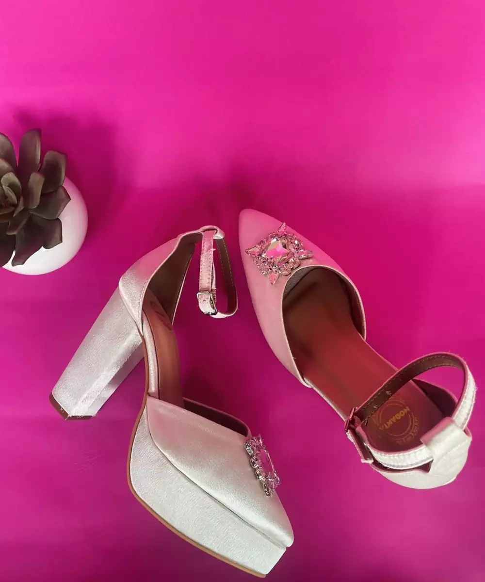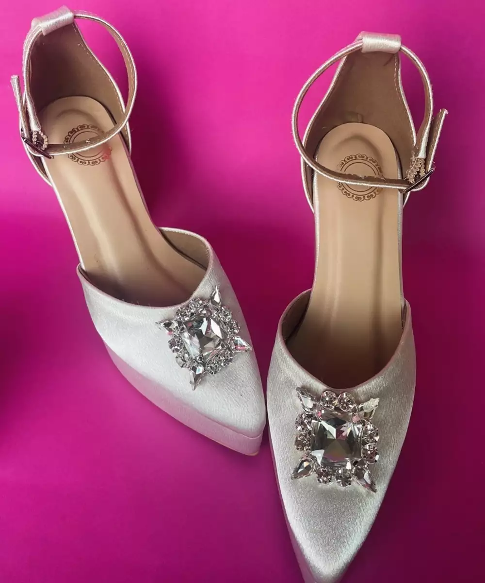 Pristine White Satin Pointed Toe Heels With Diamond Embellishment. Comes With A Soft Cushion Lining Which Makes It Extremely Comfortable And Can Be Worn For Long Hours. Our Footwear Is Vegan And Handmade By Local Artisans And Made With Utmost Love And Care!