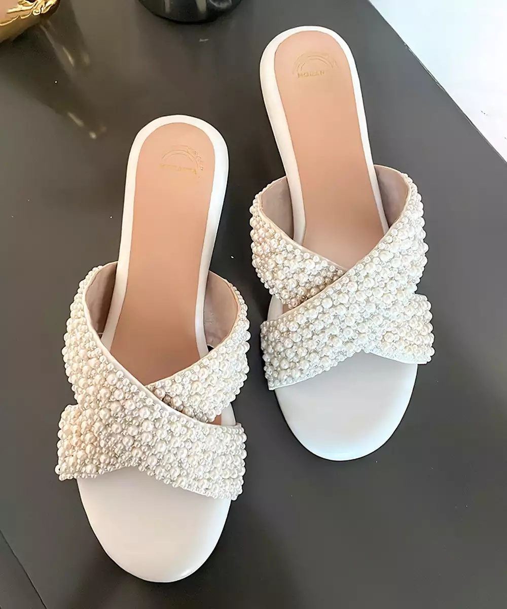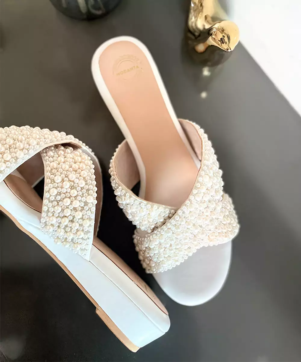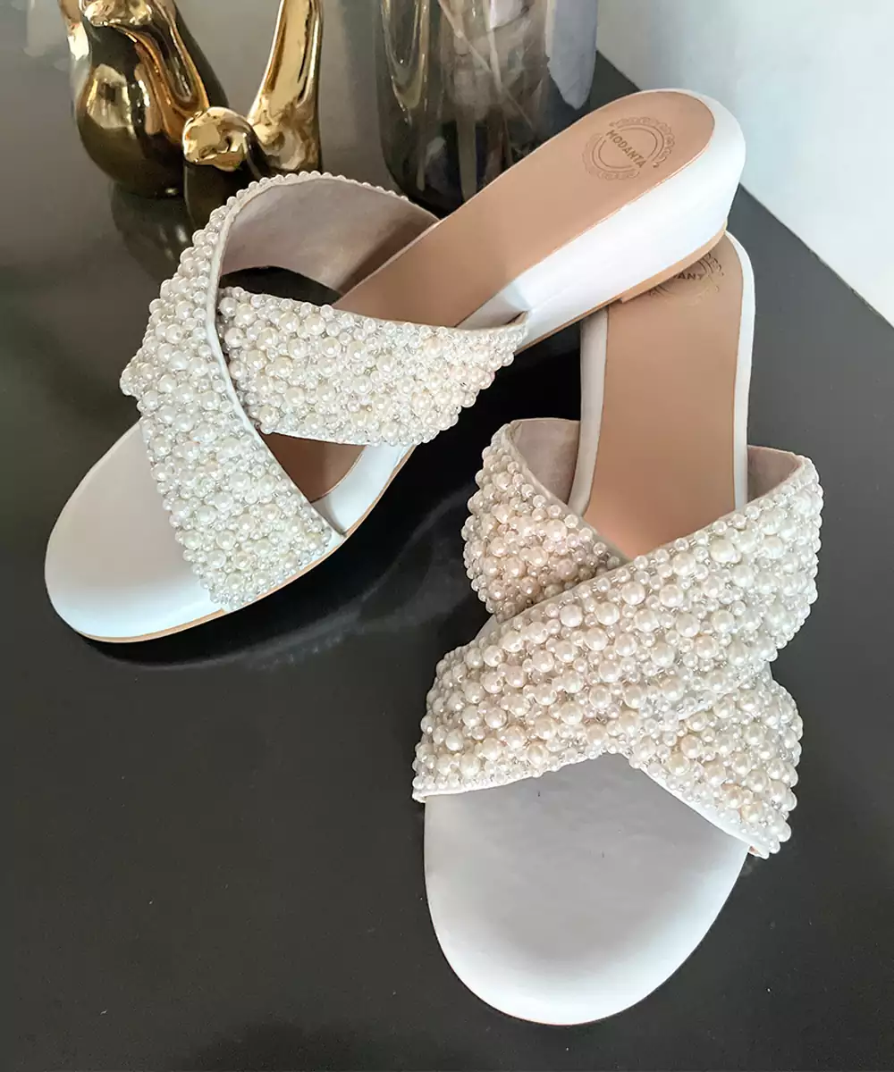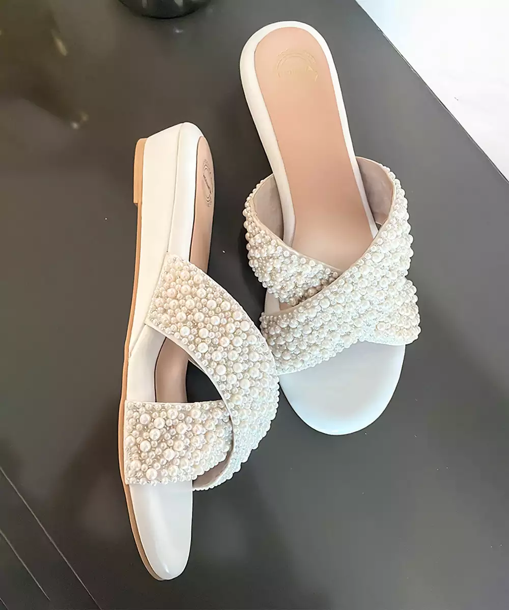Cross Strap Wedges With Pearl Embroidery. Comes With A Soft Cushion Lining Which Makes It Extremely Comfortable And Can Be Worn For Long Hours. Our Footwear Is Vegan And Handmade By Local Artisans And Made With Utmost Love And Care!