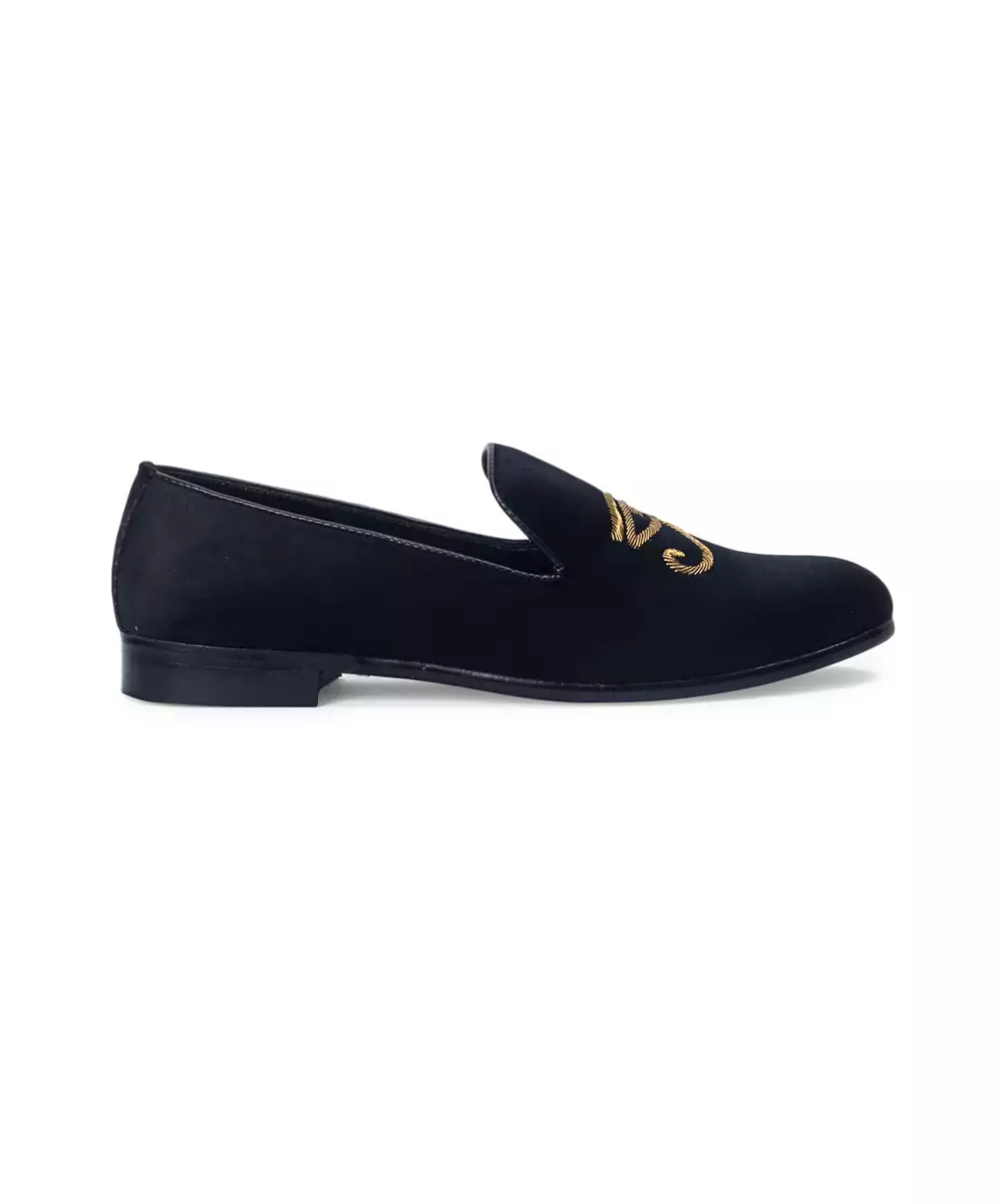 Handcrafted Zardozi Embroidery Velvet Slipons With Padded Leather Lining For Comfort And Our Signature Hardsheet Sole For Grip And Durability.