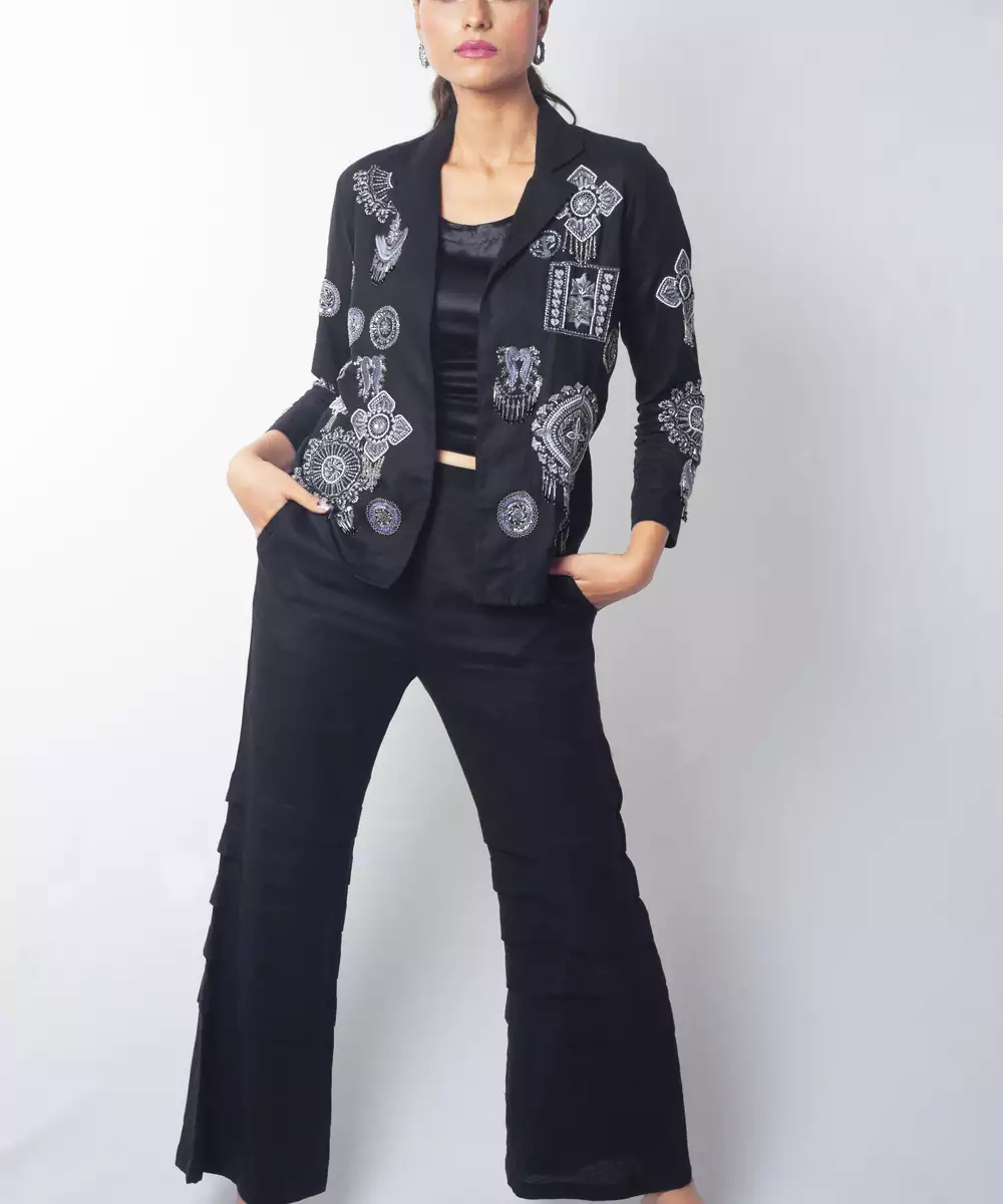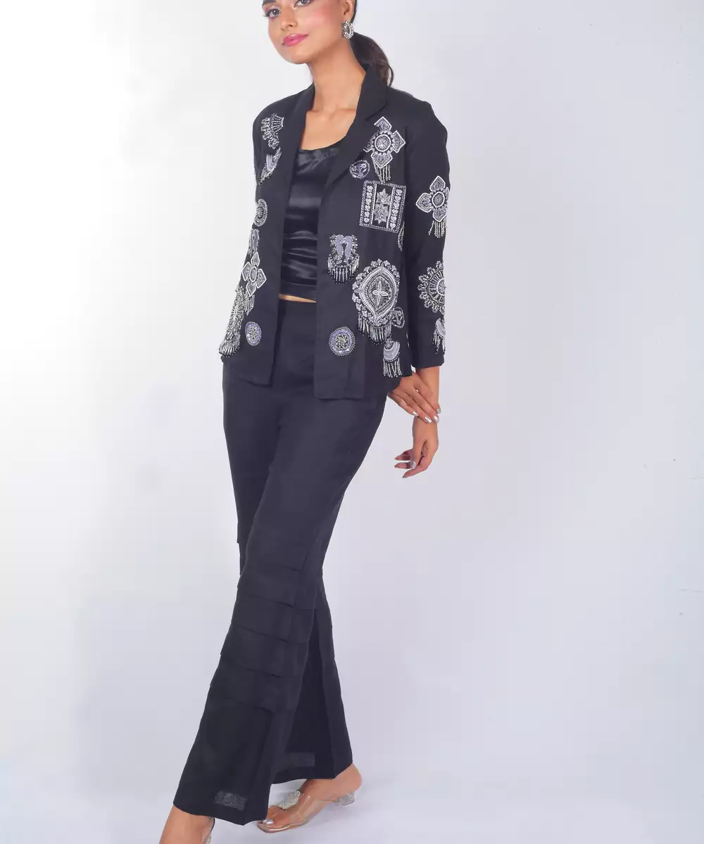 This Black Embroidered Linen Co Ord Set Showcases Soft Elegance With A Contemporary Touch. Crafted From Breathable Linen Fabric, It Features Delicate Embroidery That Adds A Refined, Stylish Charm. Perfect For Day Gatherings And Festive Occasions, It Offers A Comfortable Fit, Airy Feel, And Timeless Modern Appeal.