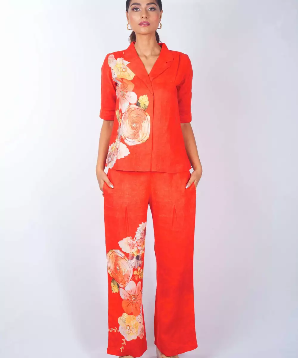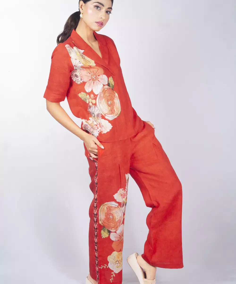 This Red Printed Linen Co Ord Set Exudes Fresh Elegance And Effortless Style. Crafted From Breathable Linen Fabric, It Features Vibrant Prints That Add A Lively, Modern Touch. Perfect For Day Outings And Casual Gatherings, It Offers A Comfortable Fit, Airy Feel, And Timeless Contemporary Charm.